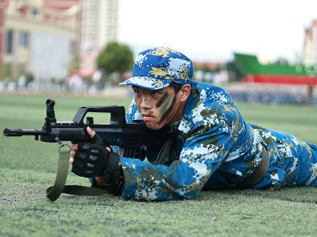 在轻武器演练中,航海交通学院新生们展现出军人般的严谨专注。他们眼神坚定,动作迅速准确。随着教官的指令,新生们迅速进入状态,或卧倒或蹲伏,模拟实战中的射击姿势。轻武器演练不仅是对新生们身体协调性和心理素质的锻炼,也是对团队合作和战术理解的培养。