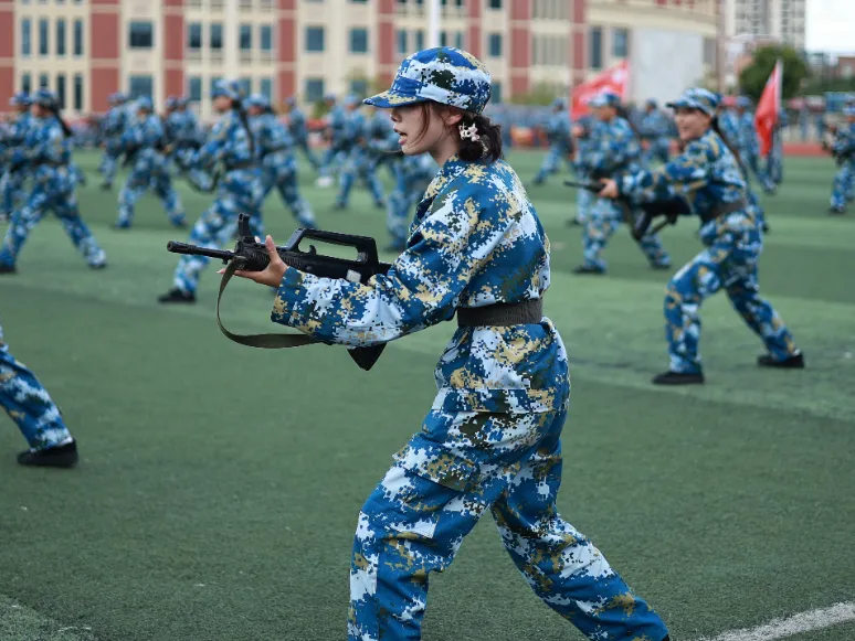 在模拟的战场环境中,艺术体育学院的新生们迅速而有序地展开行动,动作协调一致,步伐稳健有力。他们展示了快速前进、低姿态匍匐、战术翻滚和掩护射击等战术动作。每一次位置变换都显得井然有序,动作迅速而准确。战术表演不仅是对新生们身体协调性和反应速度的考验,更是对他们团队精神和战术理解的锻炼。
