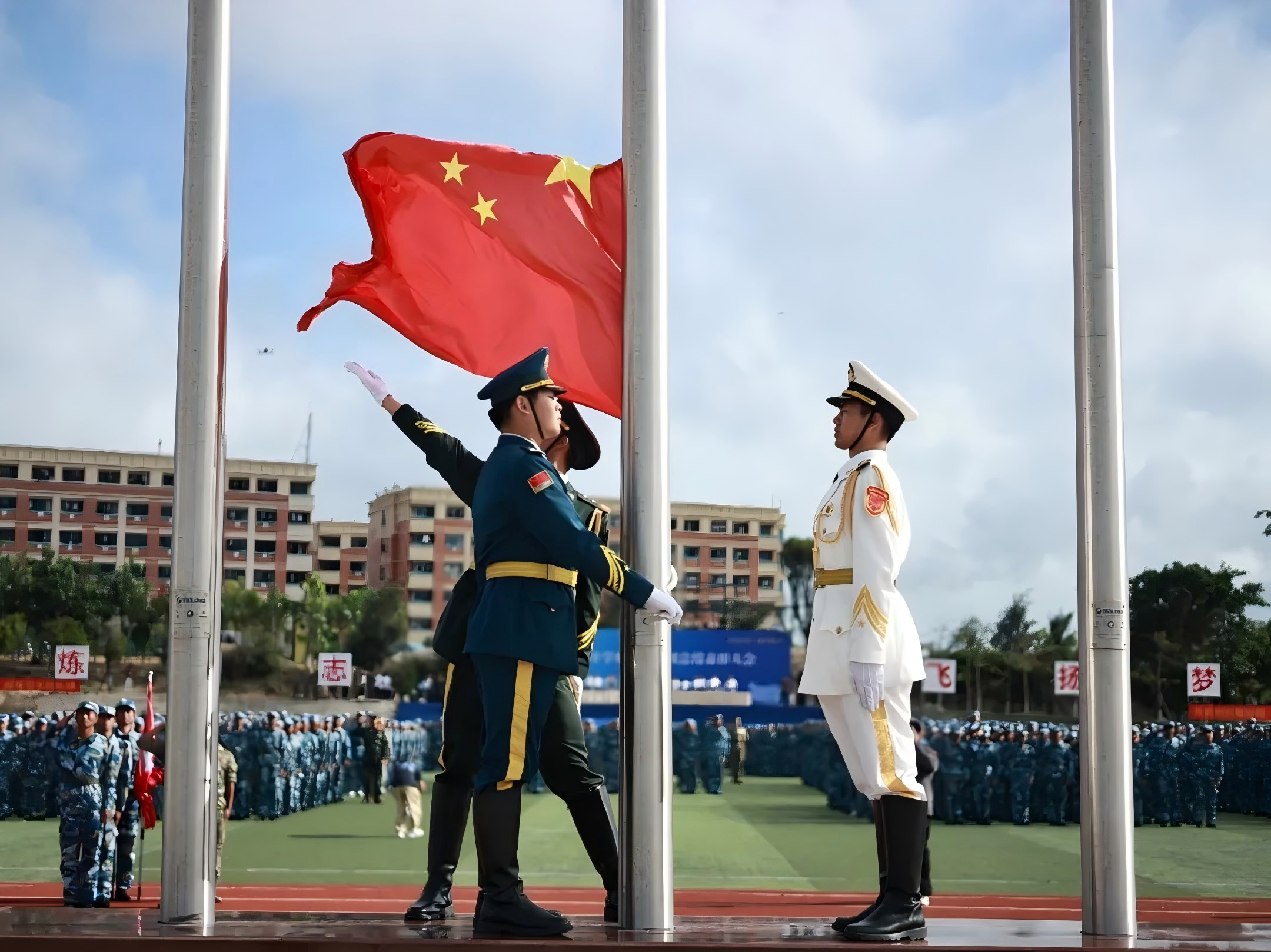 升旗仪式正开始。随着国歌的奏响,全场肃然起敬。旗杆上,国旗缓缓升起;旗杆下,国旗卫士在秋风中庄严站立;而遥望着旗杆的,是一群经过烈日淬炼的新生,以标准的军礼仰望国旗飘扬。