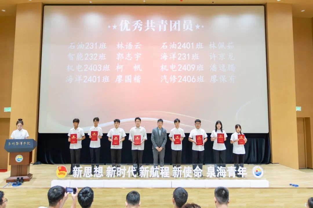 6月12日晚,海洋工程学院举办的2025年“五四”表彰大会暨2025年上半年新团员入团仪式在图书馆二楼报告厅隆重召开。海洋工程学院党支部书记周甜,校团委副书记肖伟强,海洋工程学院党支部副书记俞建梁、团委书记廖闽及全体辅导员共同参会。大会由林知诺主持。