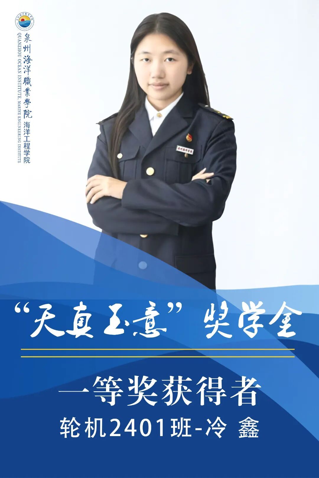 冷鑫,女,共青团员,就读于泉州海洋职业学院海洋工程学院24轮机工程技术专业。上学年综测、智育均排专业第1,获得2025年第十五届全国大学生电子商务大赛“创新、创意及创业”挑战赛福建赛区省级选拔赛第一名,2025年泉州海洋职业学院“三好学生”,2025年泉州海洋职业学院“优秀实践个人”,2024年泉州海洋职业学院校园心理剧三等奖。