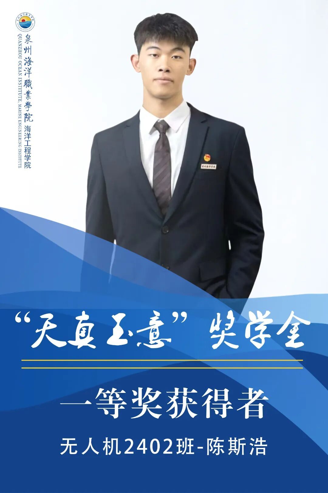 陈斯浩,男,共青团员,就读于泉州海洋职业学院海洋工程学院24无人机应用技术专业。上学年综测、智育均排专业第3,获得2025年第十五届全国大学生电子商务“创新、创业及创意”挑战赛省赛“一等奖”、校赛“一等奖”;获得2025年泉州海洋职业学院“优秀学生标兵”;获得2024年泉州海洋职业学院军训“优秀标兵”。