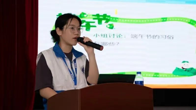 活动伊始,志愿者代表郑晓蓉通过ppt给小朋友们科普端午的起源和习俗。围绕端午文化,郑晓蓉同学巧妙设问,极大地激发了小朋友们对端午文化的兴趣。在积极回答问题的过程中,小朋友们对端午文化的认知更加深化,与志愿者们打成一片,整个教室洋溢着欢声笑语。