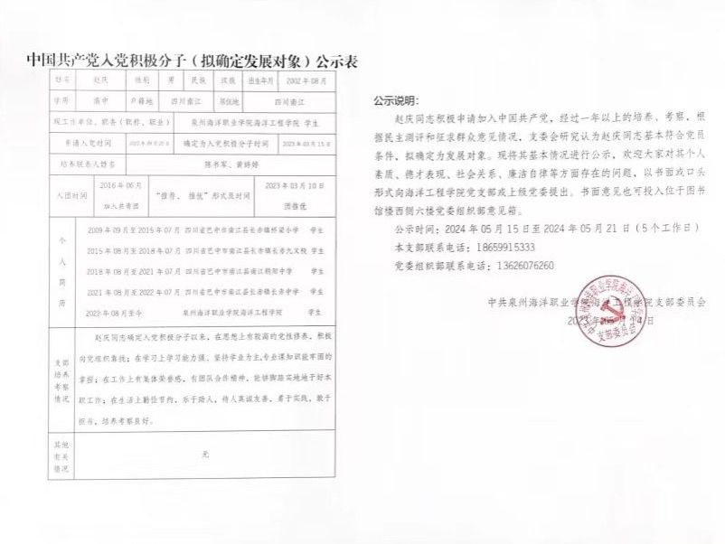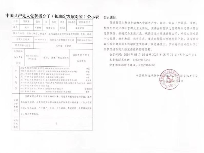 傅随策、刘雨杰、陈铸豪、赵庆、常家鹏5名同志积极申请加入中国共产党,经过一年以上的培养、考察,根据民主测评和征求群众意见情况,支委会研究认为以上5名同志基本符合党员条件,拟确定为发展对象。现将其基本情况进行公示: