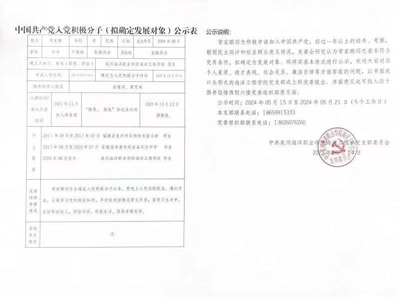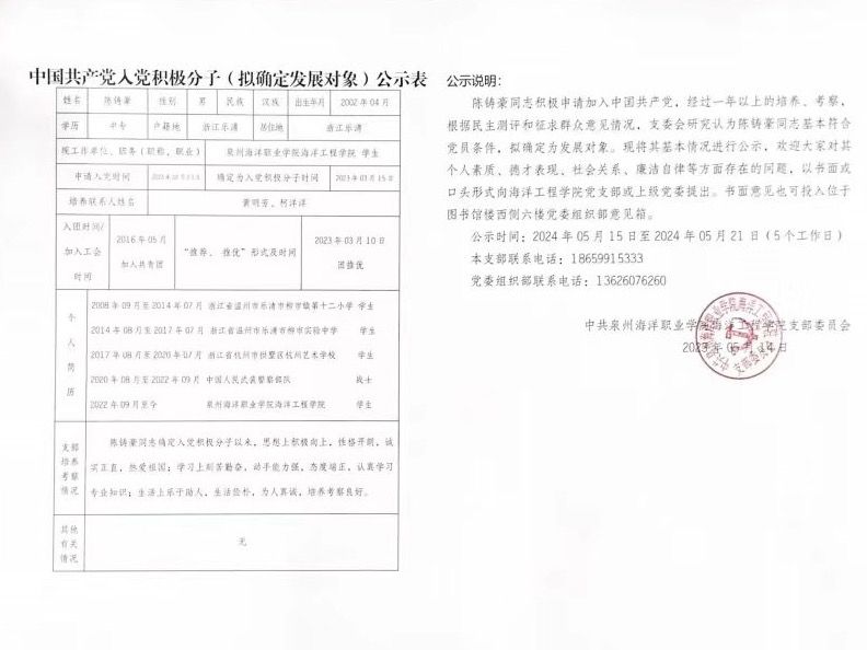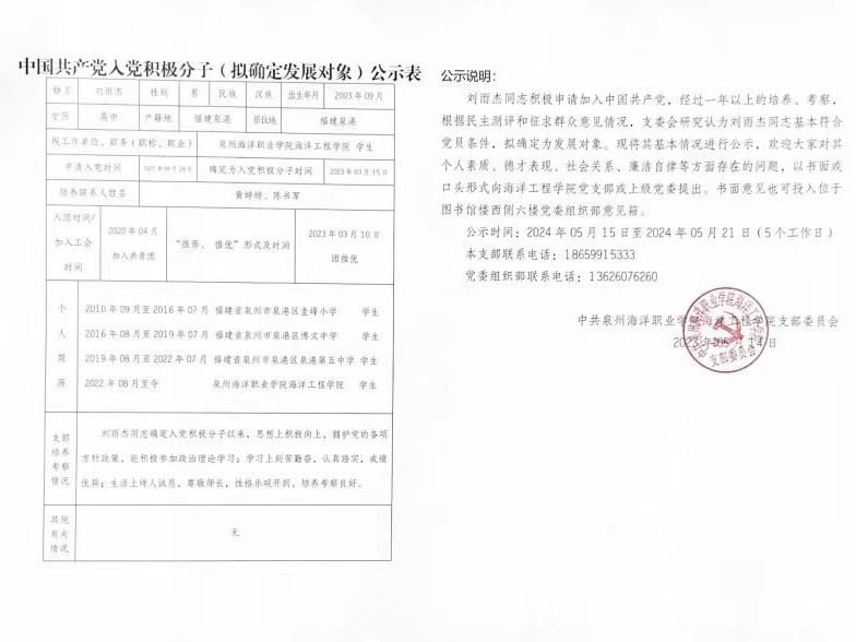 海洋工程学院党支部拟确定发展对象名单公示