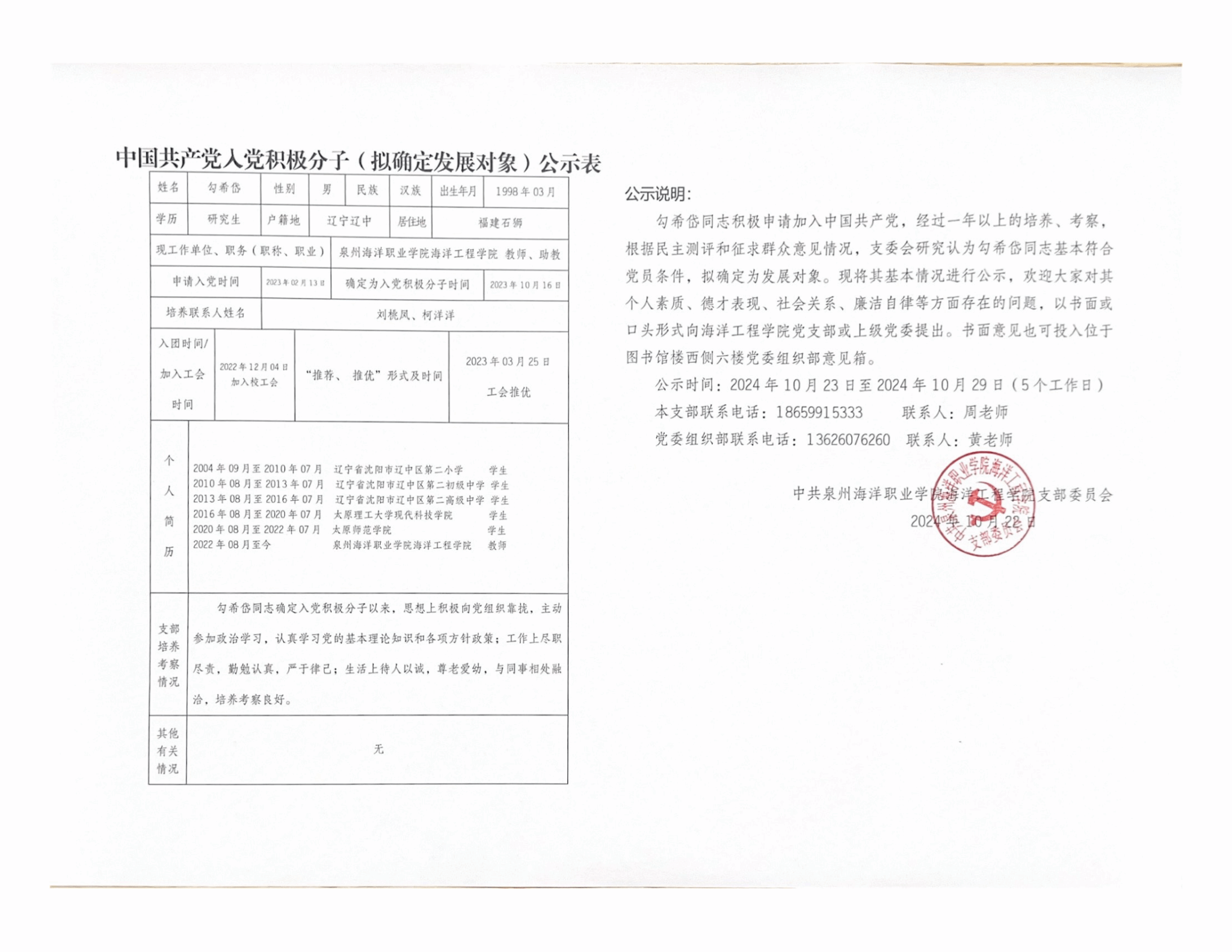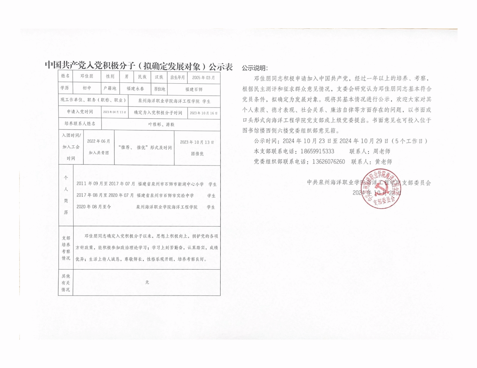 勾希岱、邓佳朋2名同志积极申请加入中国共产党,经过一年以上的培养、考察,根据民主测评和征求群众意见情况,支委会研究认为以上2名同志基本符合党员条件,拟确定为发展对象。现将其基本情况进行公示: