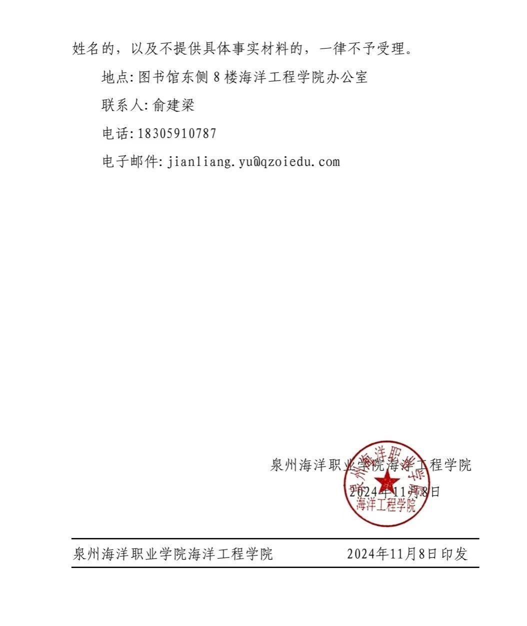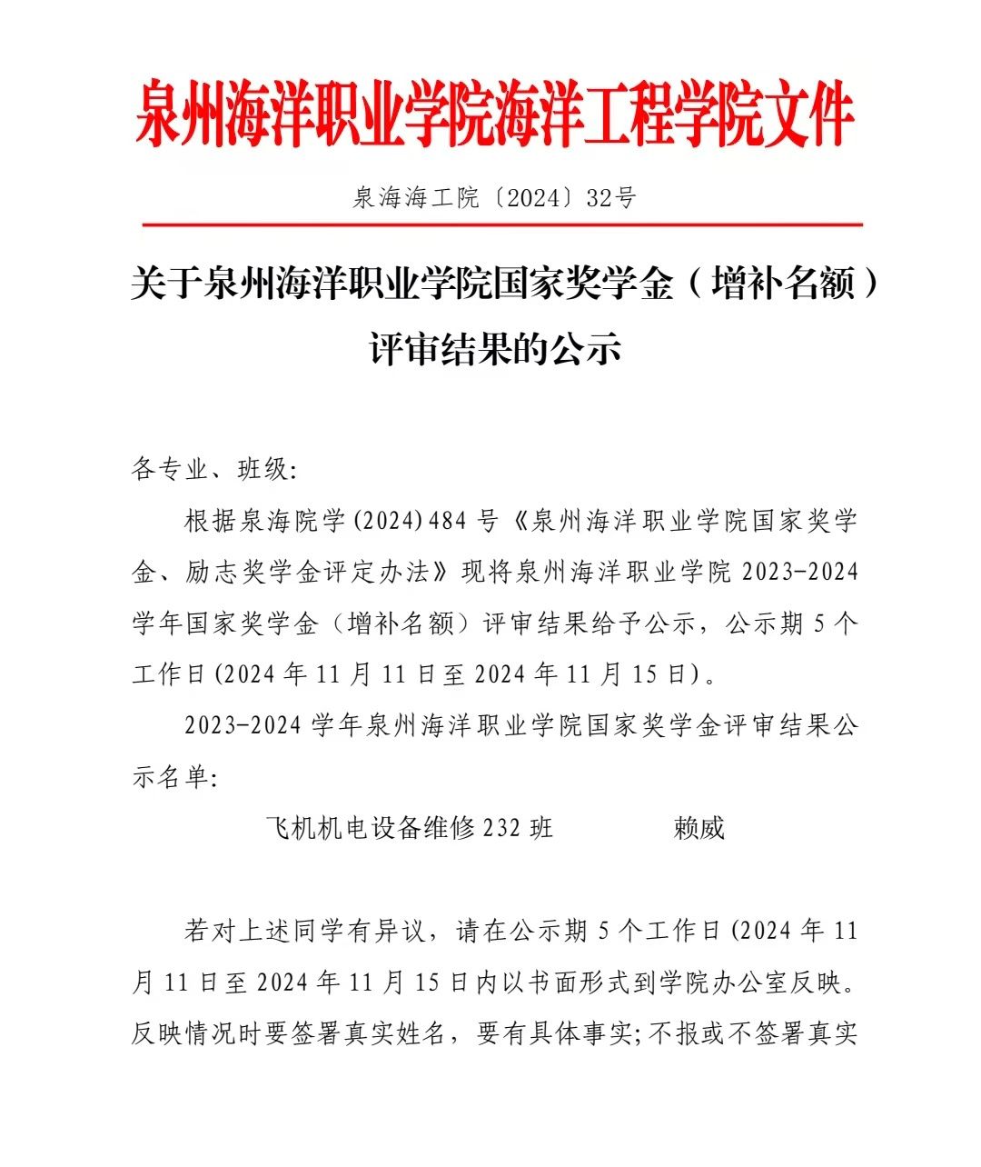下一篇:关于泉州海洋职业学院国家奖学金(增补名额)评审结果的公示