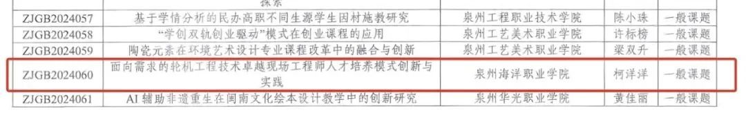 近日,福建省职业技术教育中心公布《关于组织开展2024年福建省职业教育研究课题立项申报工作的通知》(闽职教中〔2024]14号),经中心组织专家评审,确定教学改革研究常规项目262项(重点课题25项,一般课题237项)和委托课题8项。其中,泉州海洋职业学院海洋工程学院柯洋洋老师报送的“面向需求的轮机工程技术卓越现场工程师人才培养模式创新与实践”成功入选。