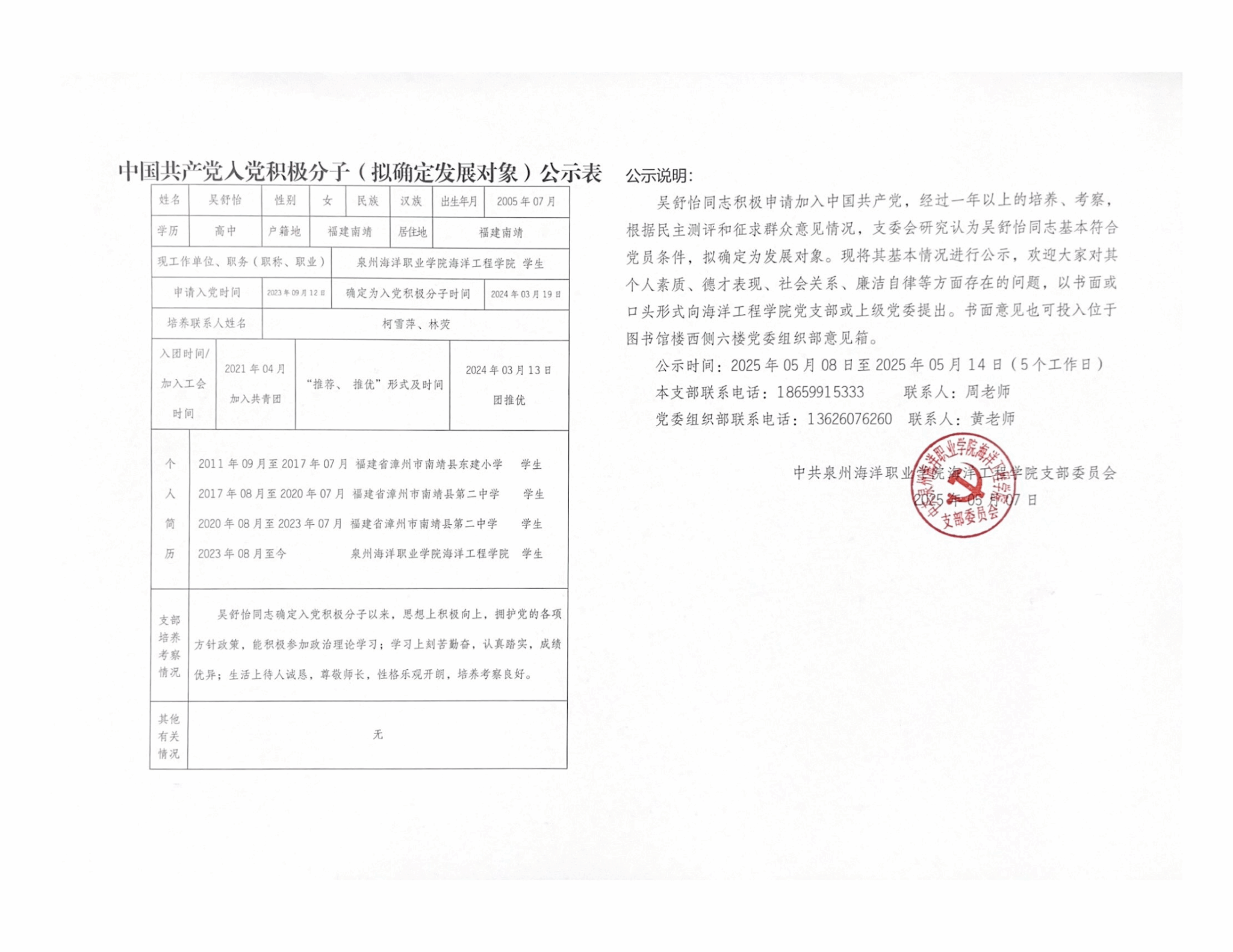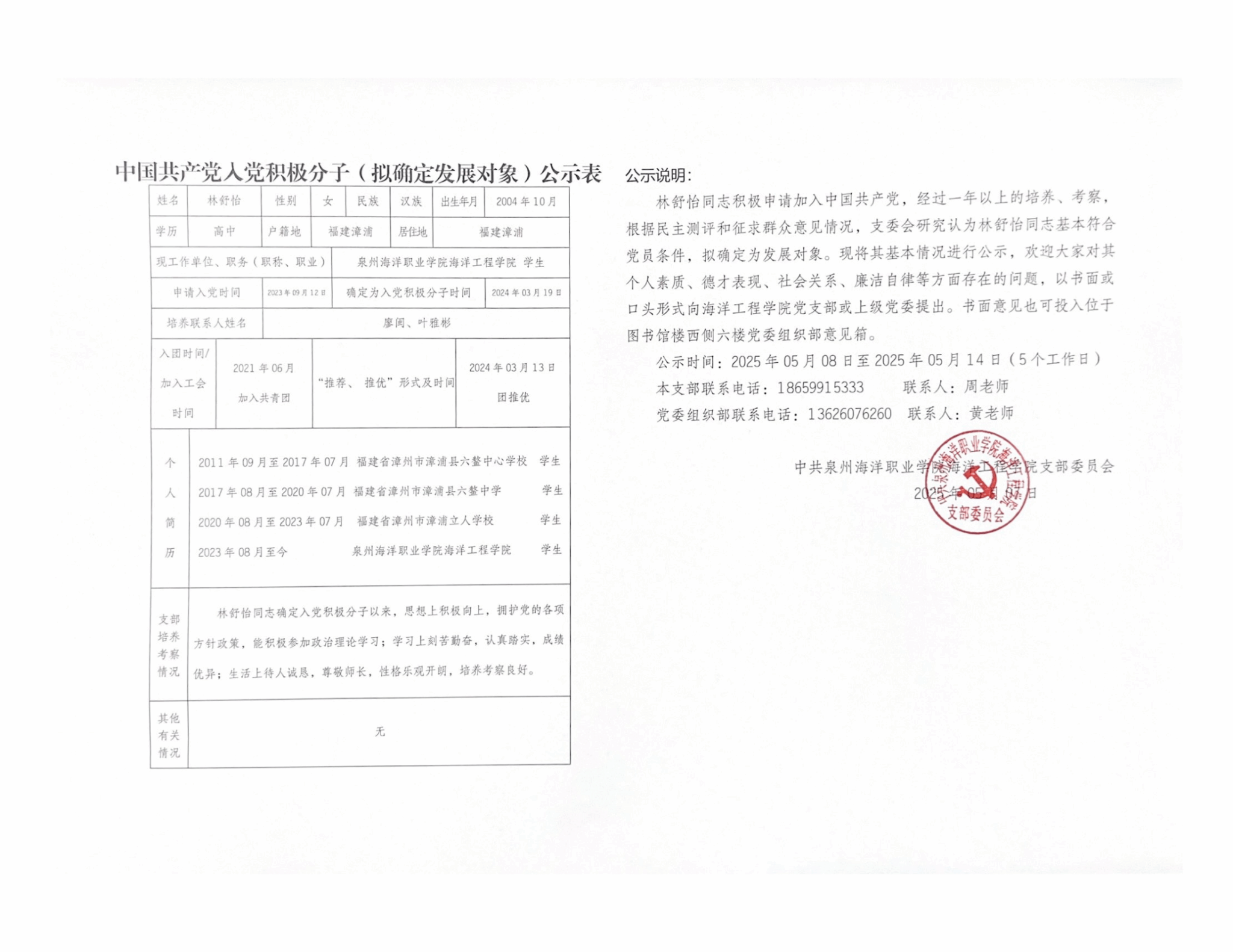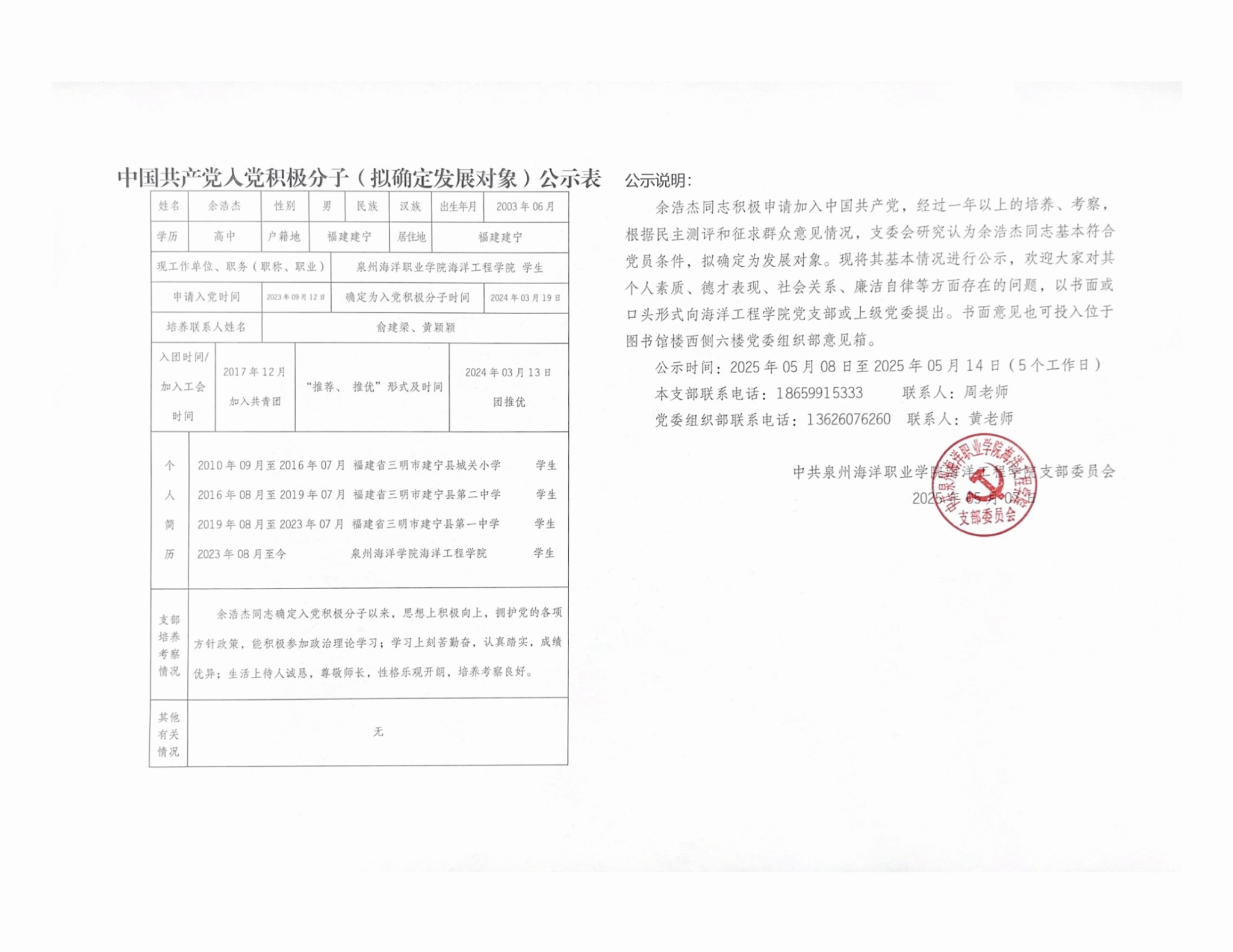 余浩杰、吴舒怡、郑淑珍、郑晓蓉、林舒怡、姚啸天、徐心茹、谢尚恒8名同志积极申请加入中国共产党,经过一年以上的培养、考察,根据民主测评和征求群众意见情况,支委会研究认为以上8名同志基本符合党员条件,拟确定为发展对象。现将其基本情况进行公示: