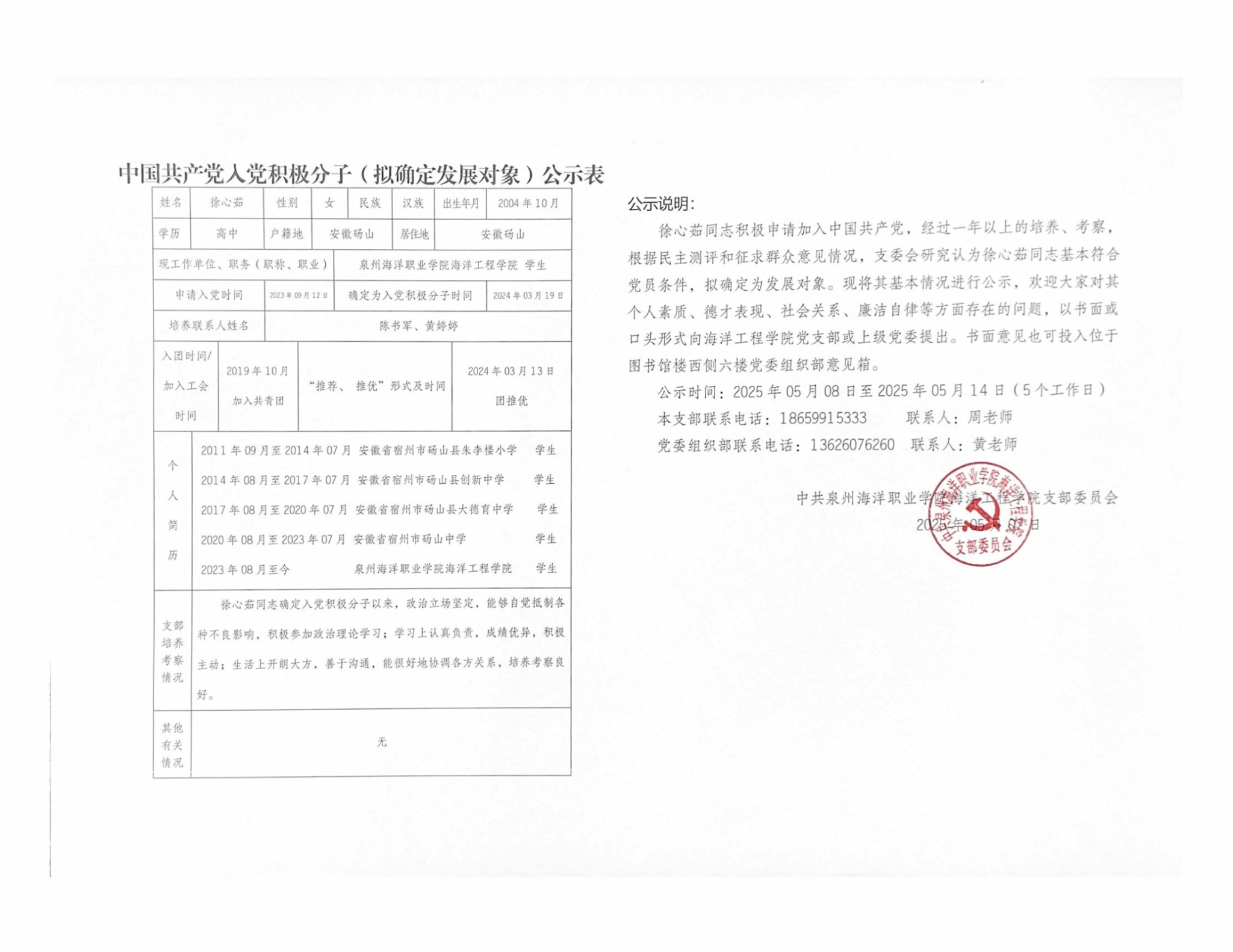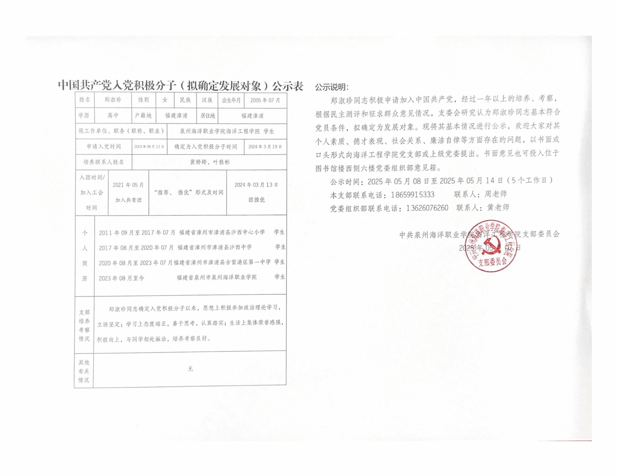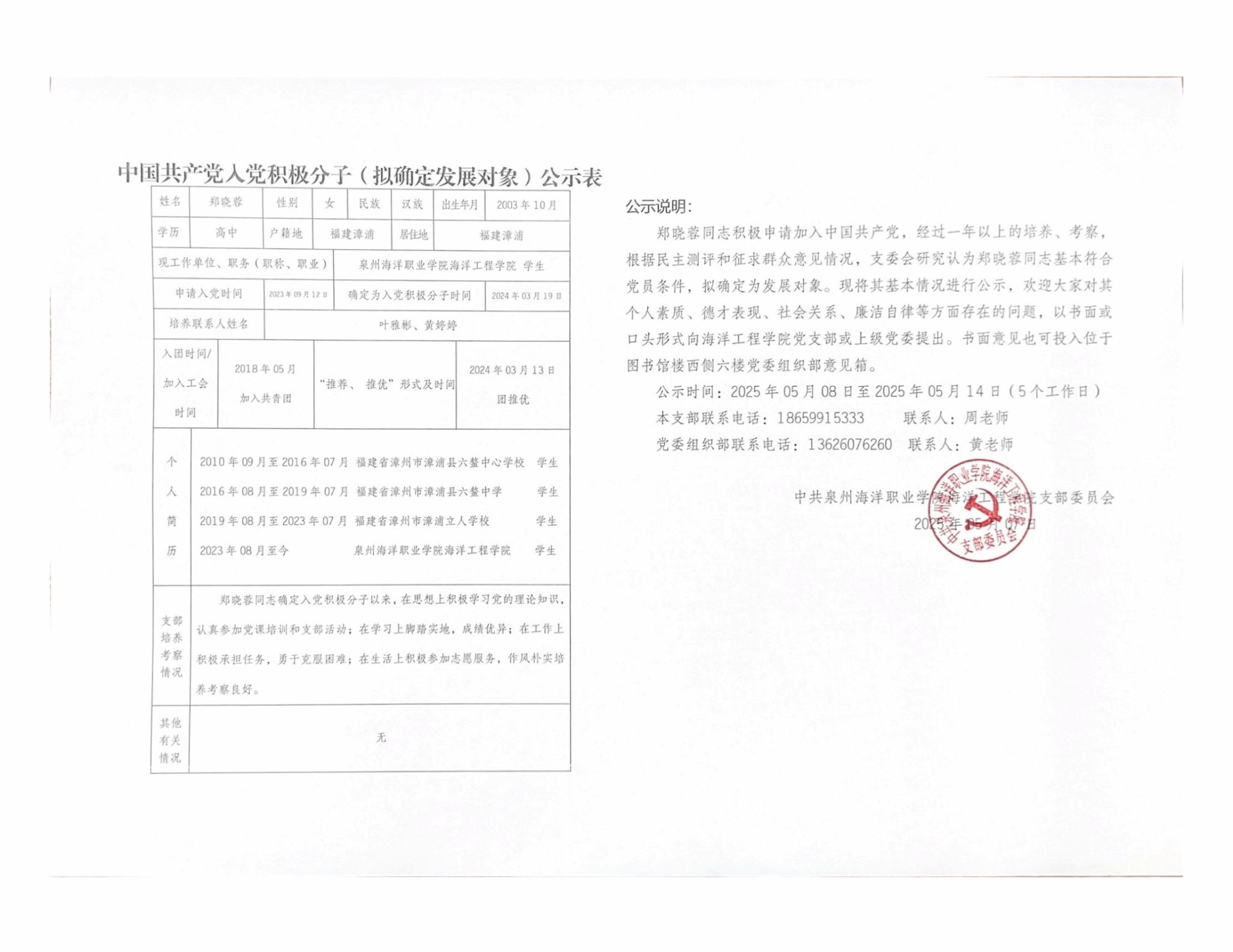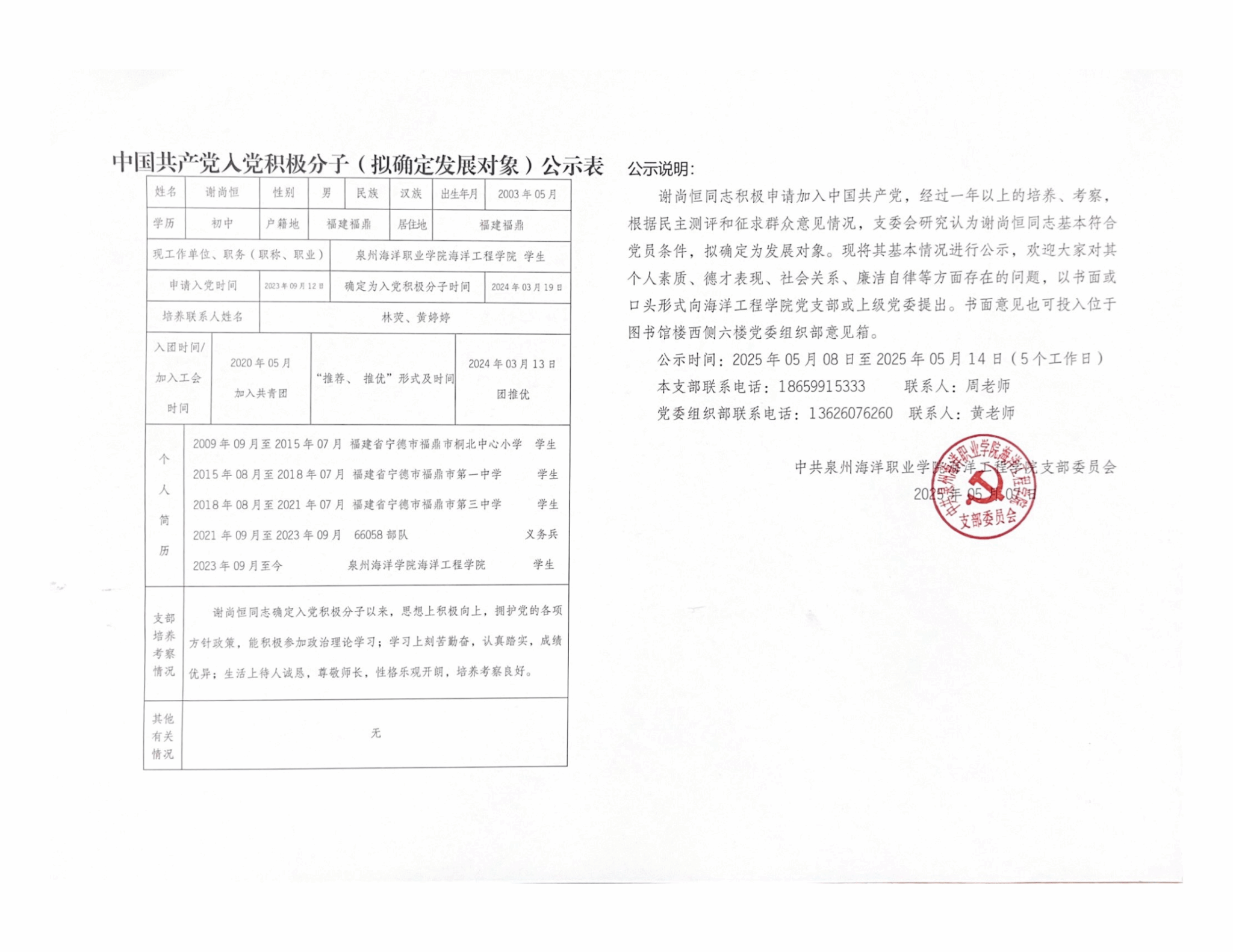 余浩杰、吴舒怡、郑淑珍、郑晓蓉、林舒怡、姚啸天、徐心茹、谢尚恒8名同志积极申请加入中国共产党,经过一年以上的培养、考察,根据民主测评和征求群众意见情况,支委会研究认为以上8名同志基本符合党员条件,拟确定为发展对象。现将其基本情况进行公示: