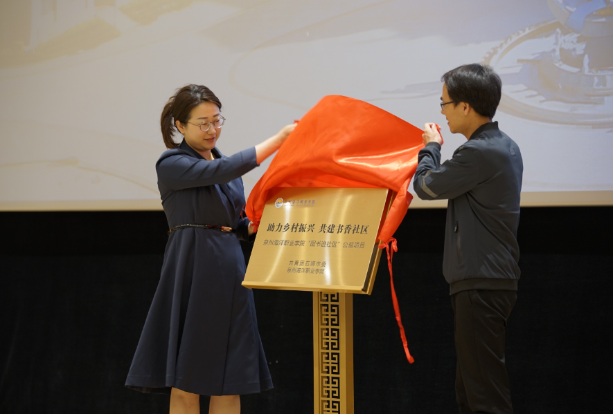 石狮市团市委书记孙甜甜与党委副书记、副校长李明灿共同为团市委乡村振兴项目揭牌。