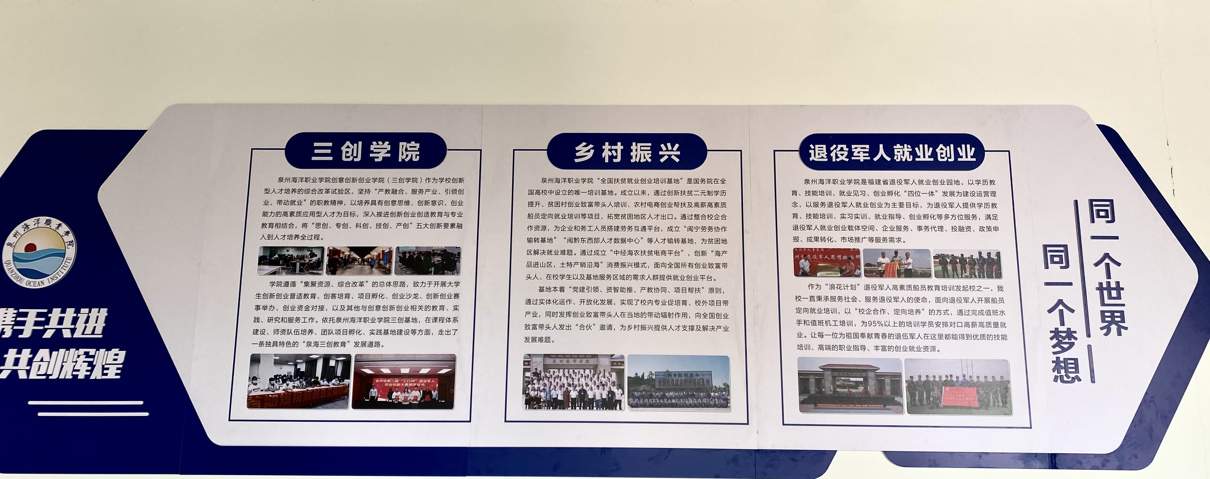 泉州海洋职业学院创意创新创业学院(三创学院)作为学校创新型人才培养的综合改革试验区,坚持“产教融合、服务产业、引领创业、带动就业”的职教精神,以培养具有创意思维、创新意识、创业能力的高素质应用型人才为目标,深入推进创新创业创造教育与专业教育相结合,将“思创、专创、科创、技创、产创” 五大创新要素融入到人才培养全过程。 学院遵循 “集聚资源、综合改革,的总体思路,致力于开展大学生创新创业普适教育、创客培育、项目孵化、创业沙龙、创新创业赛事举办、创业资金对接,以及其他与创意创新创业相关的教育、实践、研究和服务工作。依托泉州海洋职业学院三创基地,在课程体系建设、师资队伍培养、团队项目孵化、实践基地建设等方面,走出了一条独具特色的 “泉海三创教育”发展道路。