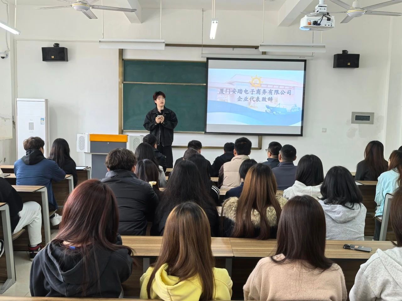 随后,安踏斐乐企业代表郑家豪上台发言。他介绍了安踏斐乐的企业文化、发展历程以及在行业内的地位,表达了企业对订单班人才培养的高度重视与期待。他表示,企业将与学校紧密合作,为同学们提供优质的实践平台和职业发展机会。