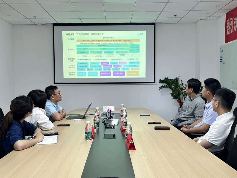 参观结束后,校企双方围绕产教融合展开座谈。金蝶培训教育事业部华南区总监魏佳丹分享了金蝶在产教融合、产业学院建设等方面的典型案例,及数字化人才培养的创新模式。双方重点就以下议题进行深入探讨: