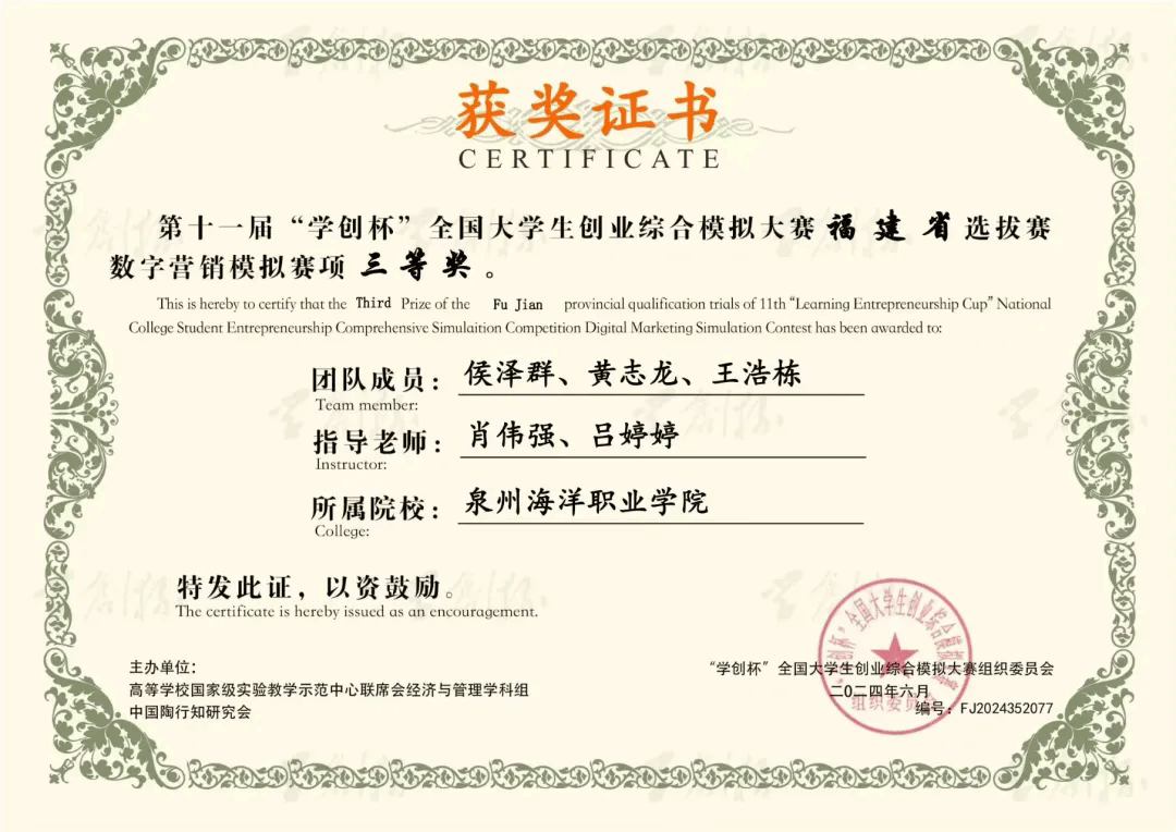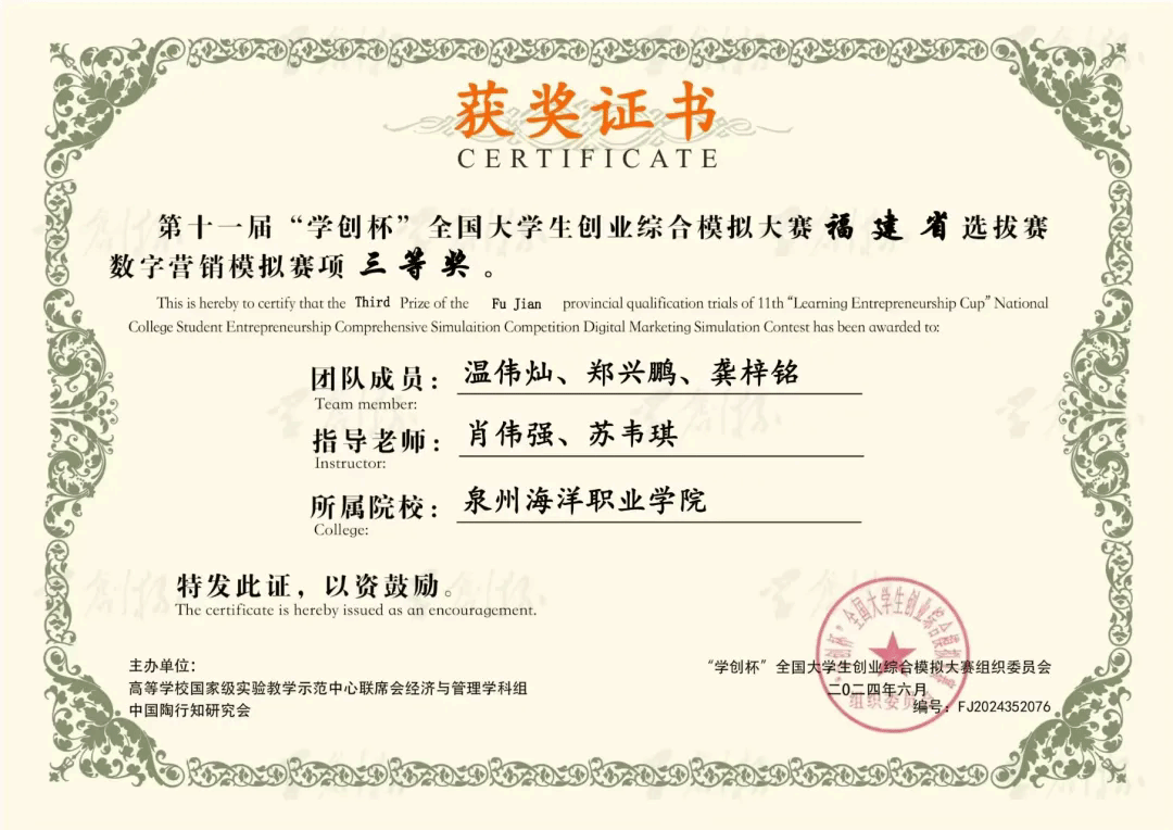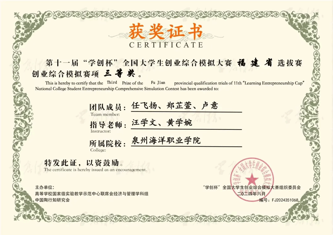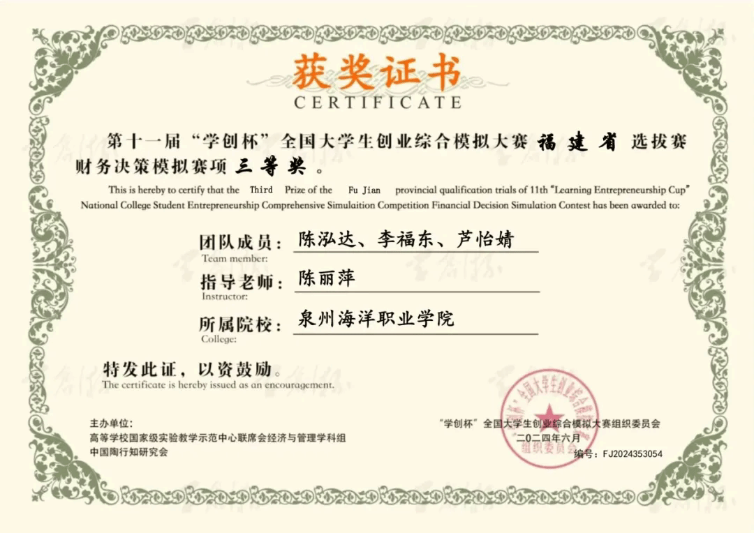 5月11日,由高等学校国家级实验教学示范中心联席会经济与管理学科组和中国陶行知研究会主办的第十一届“学创杯”全国大学生创业综合模拟大赛福建省选拔赛圆满落幕。比赛共计全省共有35所高校93支队伍参赛,我院4支队伍荣获三等奖。
