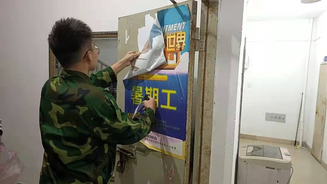 此次活动主要对八、九号男生宿舍楼和四号女生宿舍楼楼道中揭除门墙之上的无用海报以及广告。活动中,志愿者们热情高涨,团结协作,积极认真地开展工作,力求打造整洁有序的教学环境和学习空间,充分展现了志愿者们对服务校园的热爱。