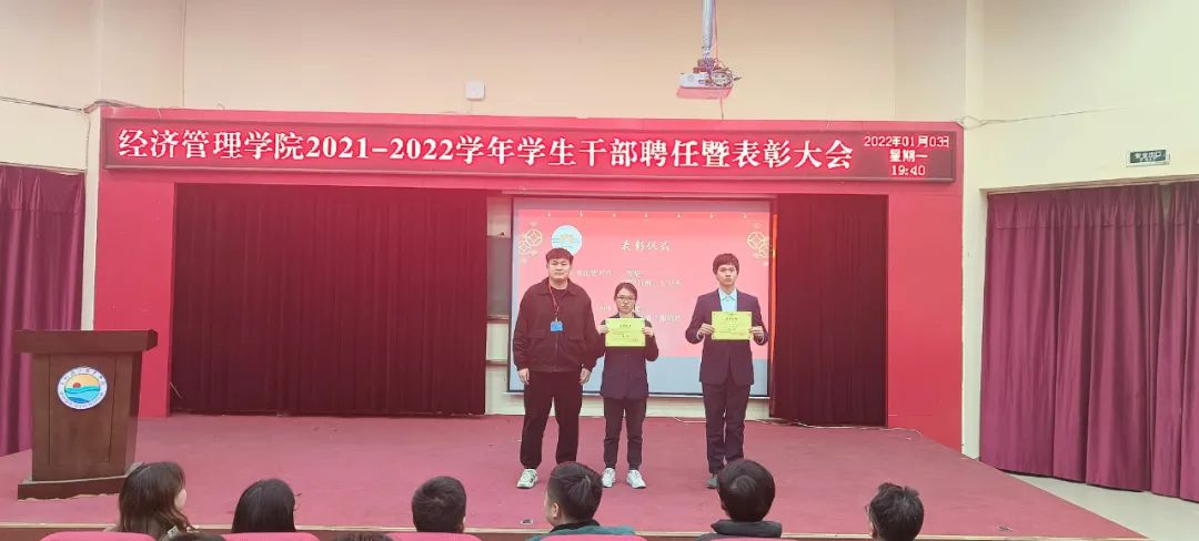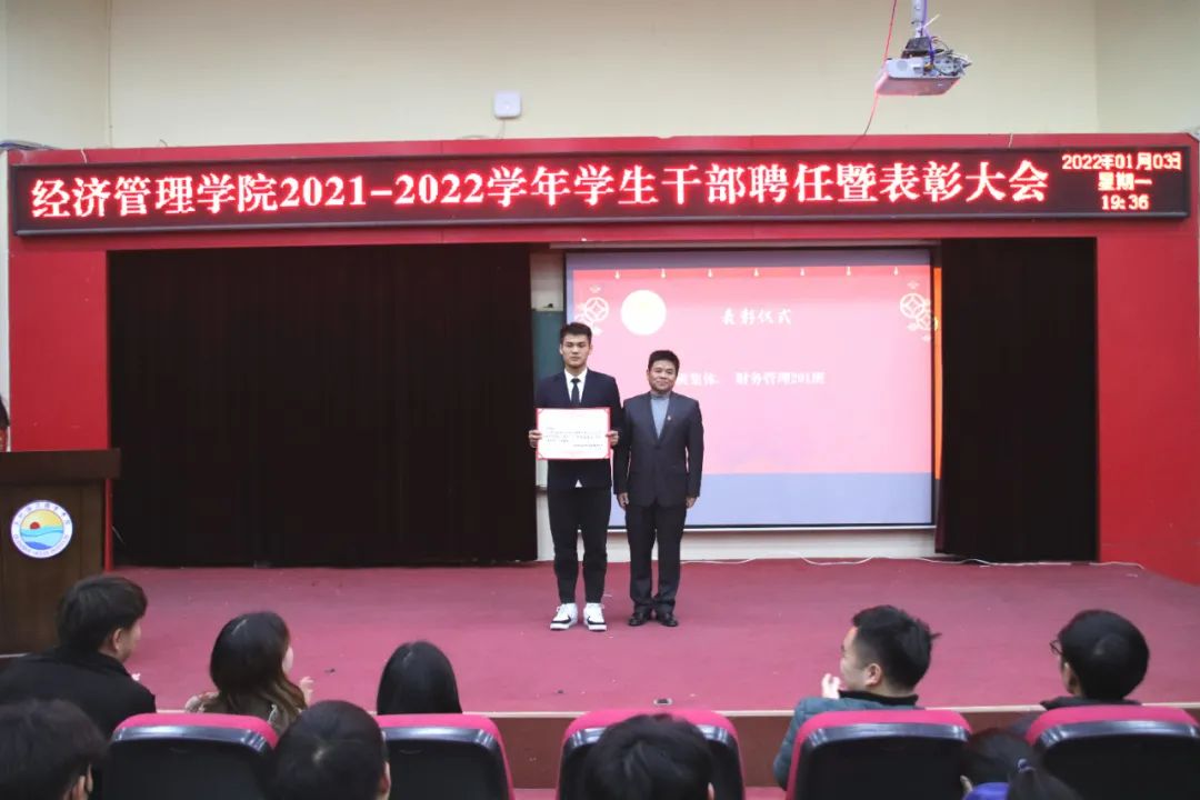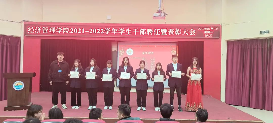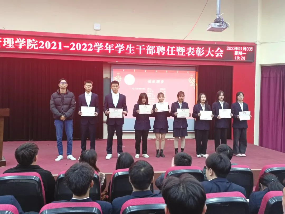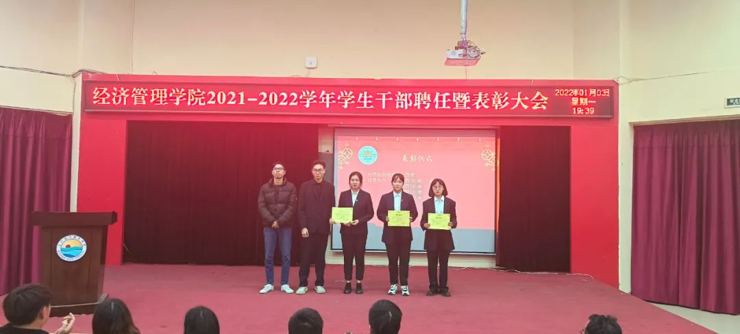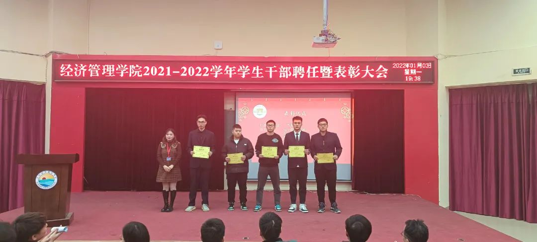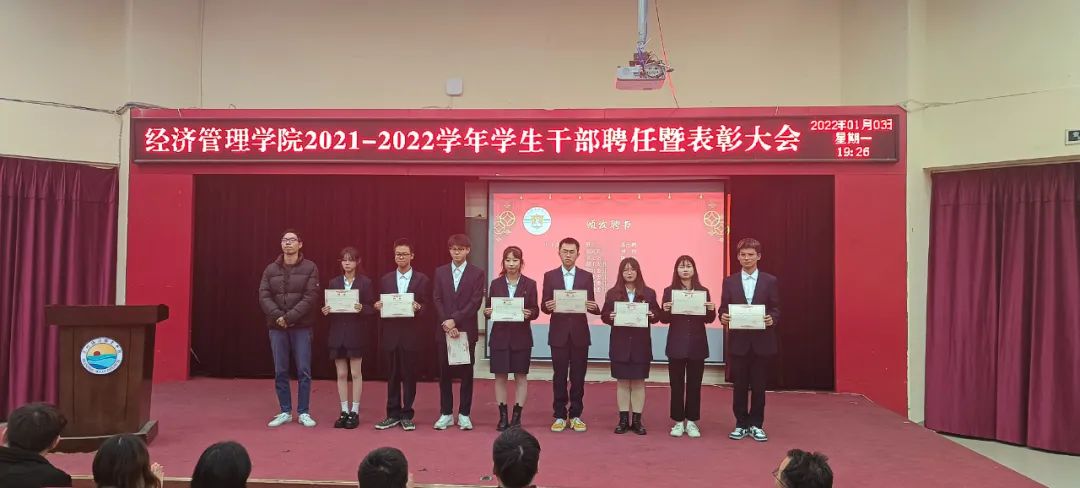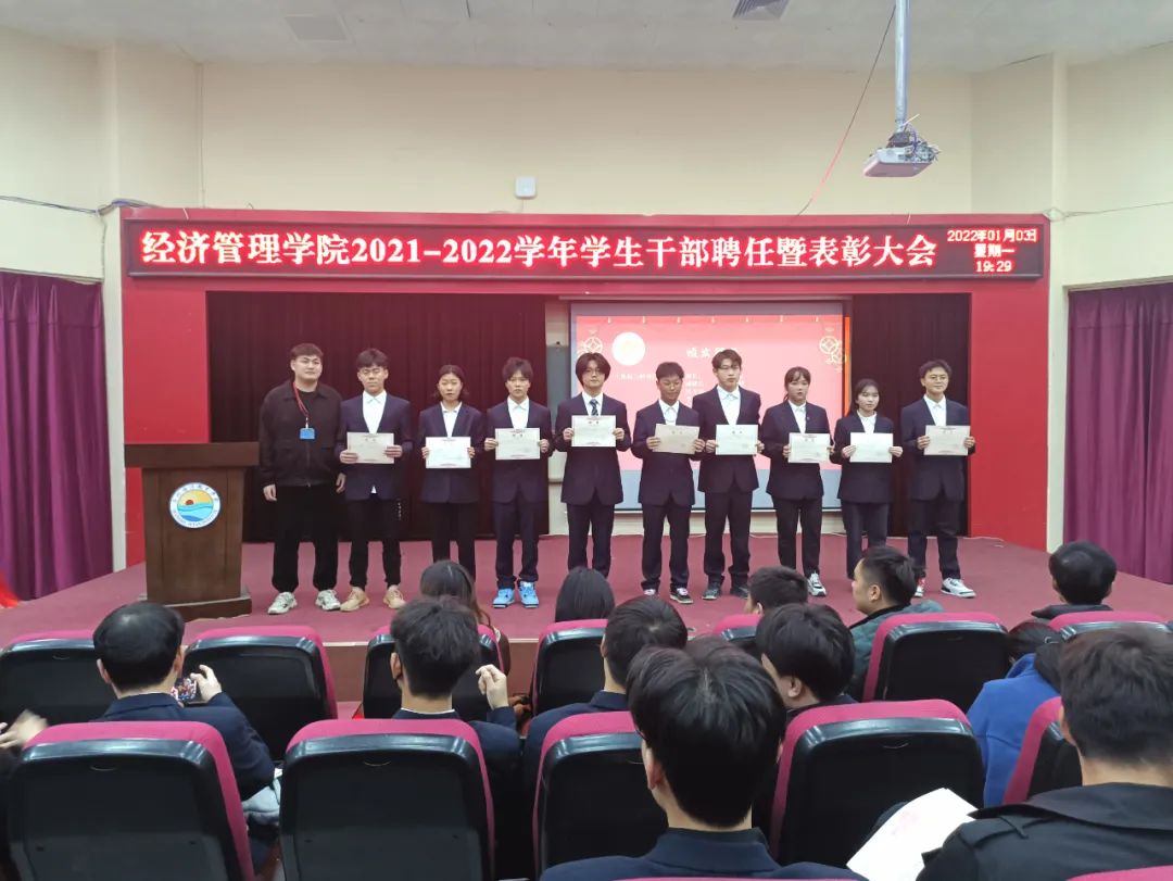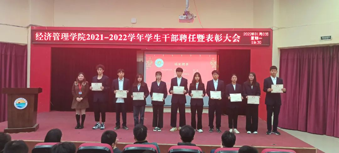 2022年1月3日晚,泉州海洋职业学院经济管理学院2021-2022年第一学期学生干部聘任暨表彰大会在2204教室顺利举行。