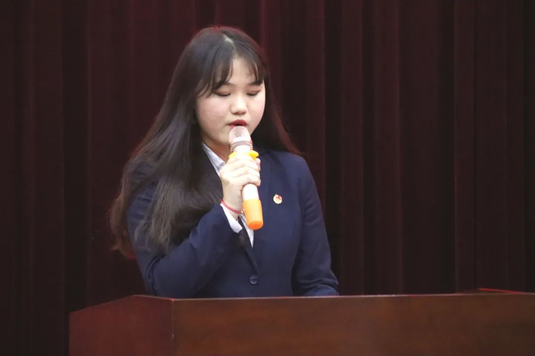 市营201班陈雨露同学作优秀学生干部代表发言。总结回顾了以往的工作情况,并作出承诺,在今后的工作中依然会认真努力,以身作则,在 院团委 、学生会中起到表率作用。