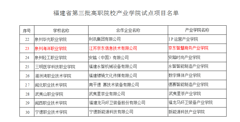 根据《福建省教育厅办公室关于做好福建省第三批高等职业院校产业学院试点申报工作的通知》(闽教办职成〔2021〕9号)要求,经设区市教育局审核、福建教育厅组织专家评审,我院与江苏京东信息技术有限公司合作共建的“京东智慧商务产业学院”获得福建省第三批高等职业院校产业学院试点项目。