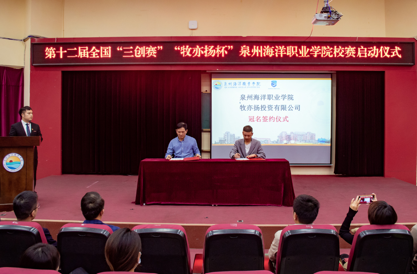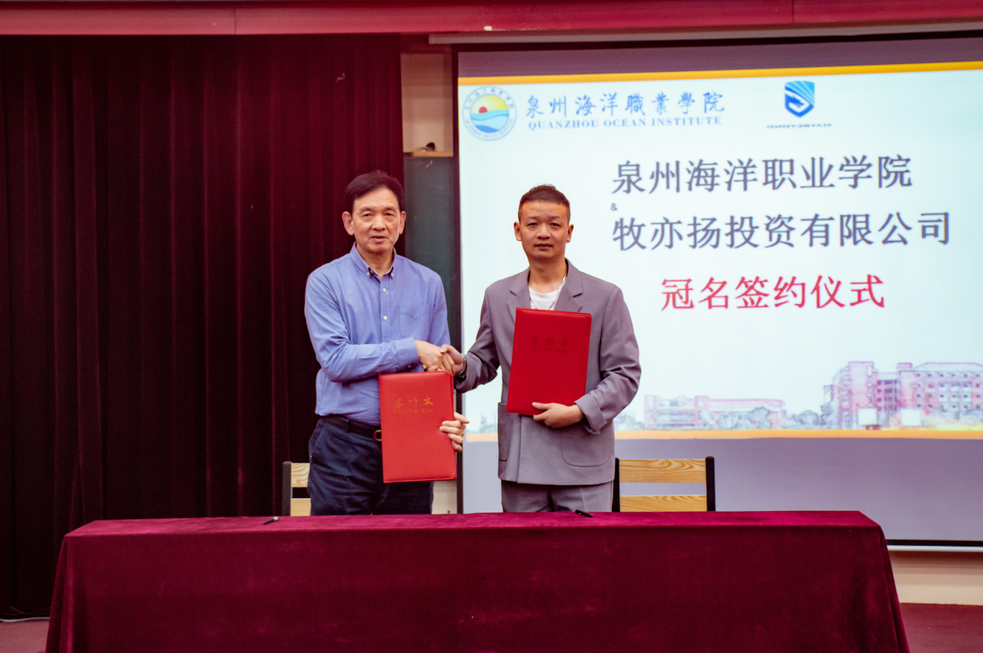 由牧亦扬投资有限公司总经理杨豪、学校校长朱国辉教授进行签约、授牌。