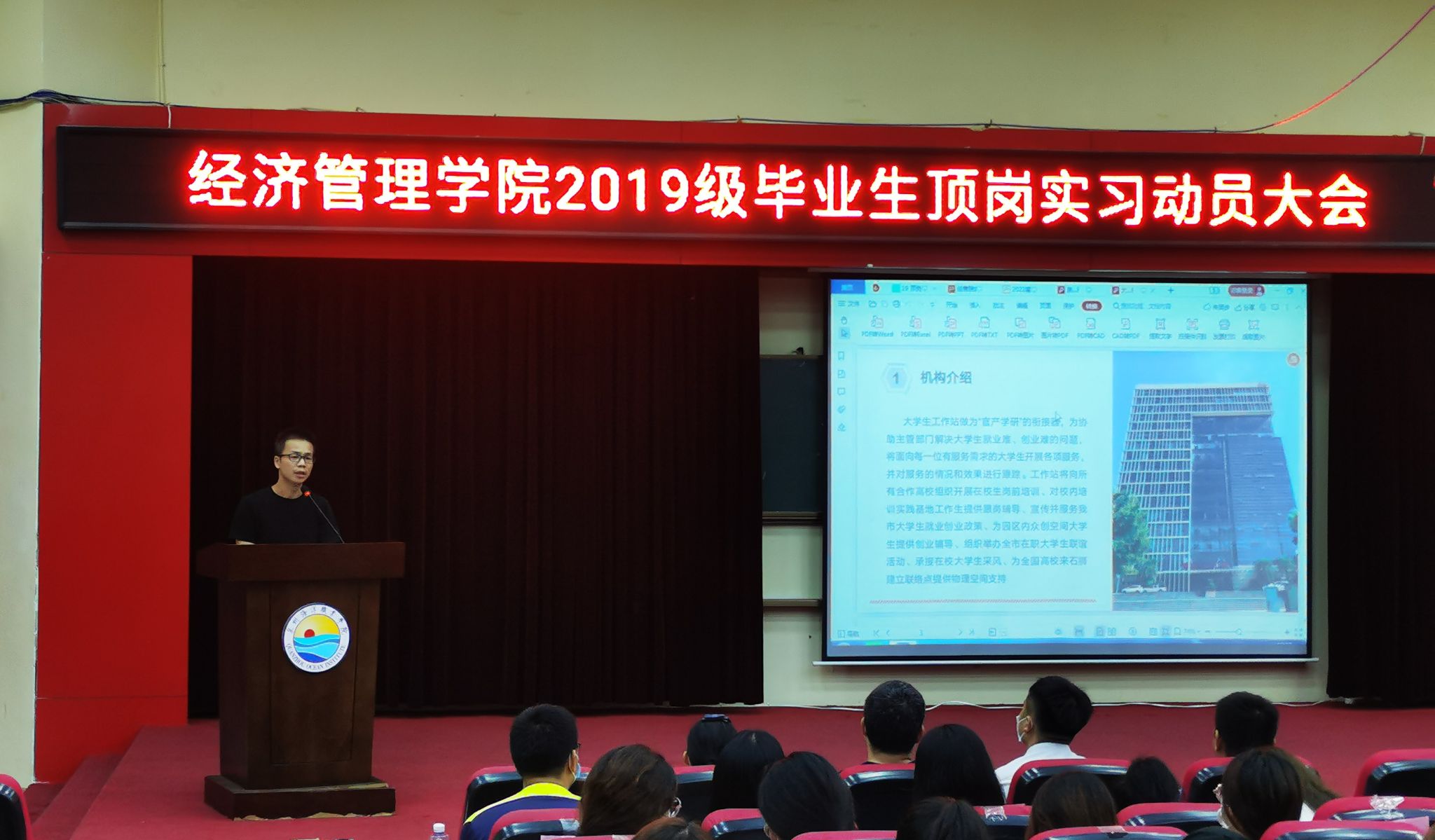 大会第四项议程,由多维创业创始人陈奇波先生为我院学子进行实习期间的政策宣讲及大学生工作站的相关介绍,大学生工作站特点主要是为在石创业或实习工作的学生提供必要的岗前培训及政策支持,服务于初步社会的莘莘学子。