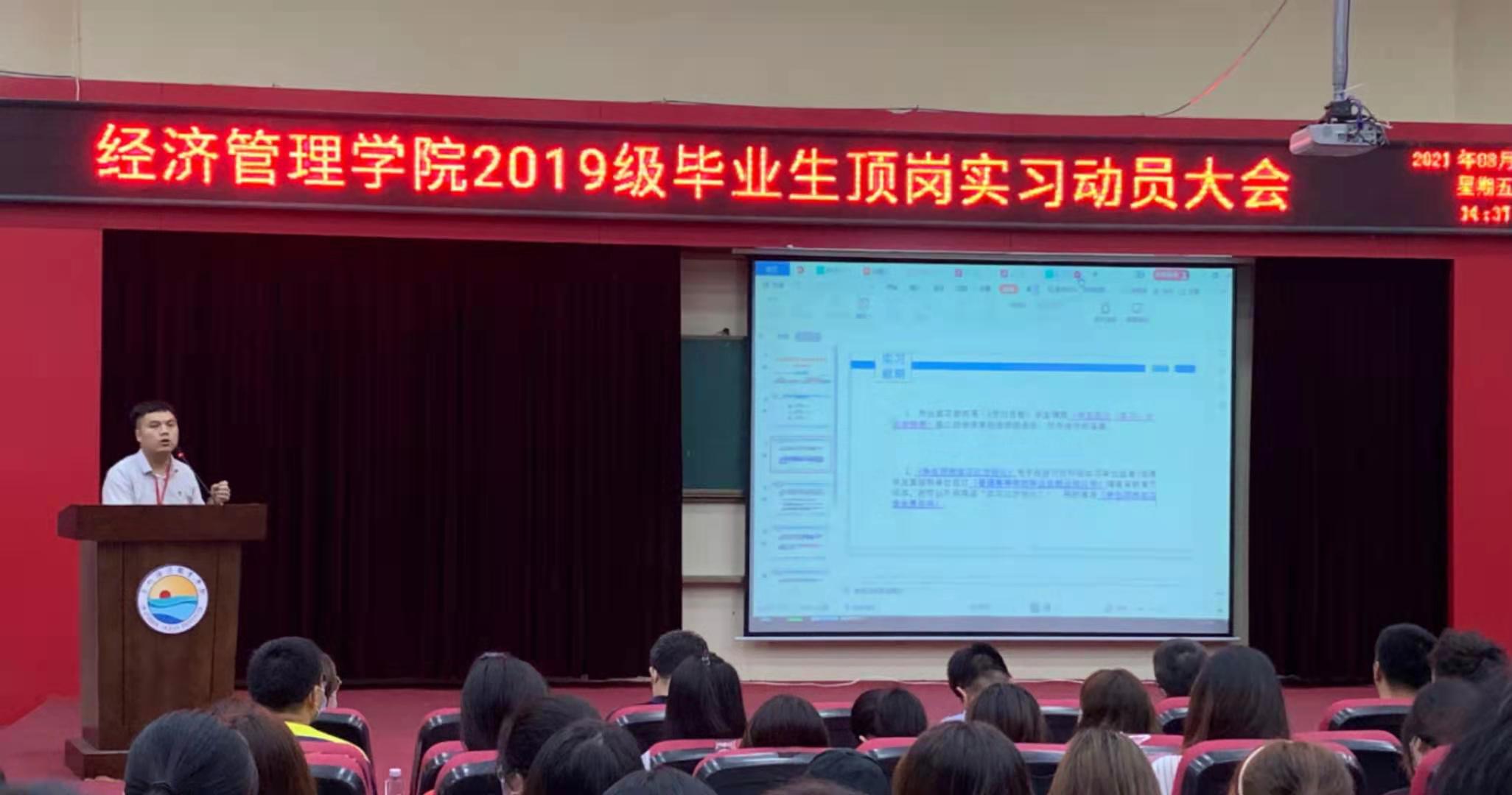 8月6日,经济管理学院于2204报告厅召开2019级毕业生顶岗实习动员大会。副校长兼经济管理学院院长杨雄教授、副院长吴志雄、多维创业创始人陈奇波先生、副书记陈合喜、院长助理吴丽清、办公室副主任徐雪婷、全体专任教师、辅导员及2019级毕业生参加了此次大会。本次大会由院学生会主席吴晓艳主持。