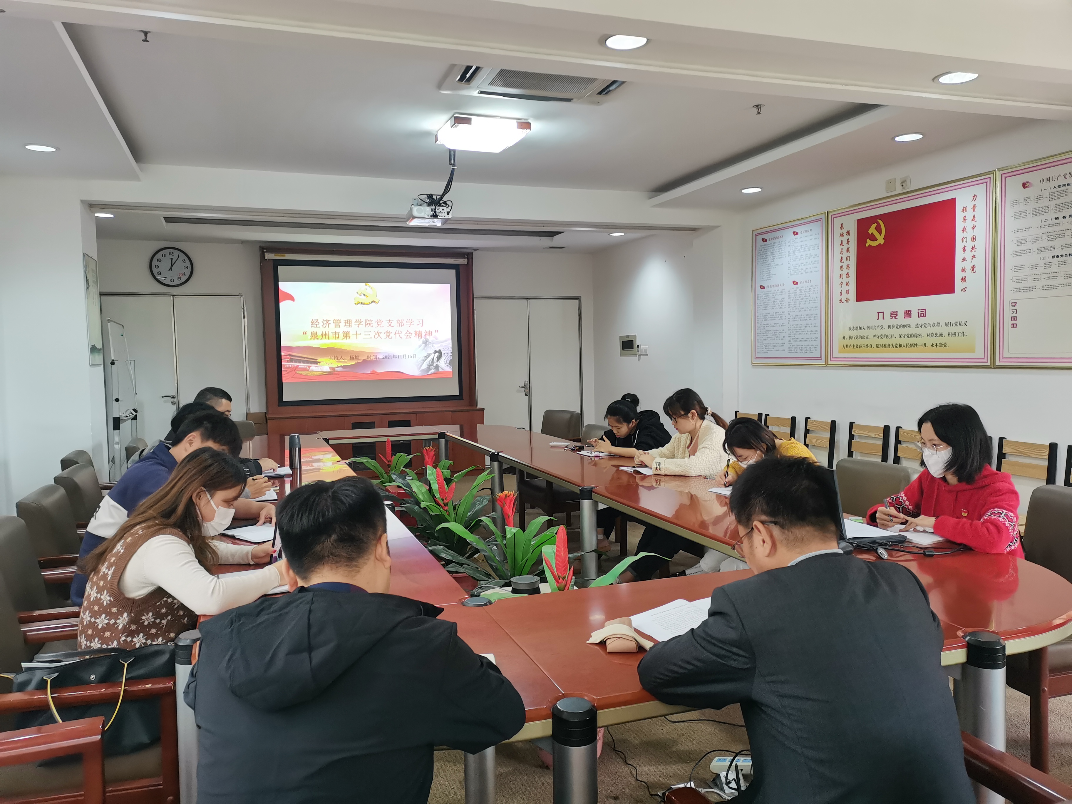 本次会议由杨雄书记宣读《在共产党泉州市第十三次代表大会上的报告》,向经济管理学院党支部全体党员传达了会议精神。会议指出,要深入学习领会,把学习宣传贯彻市第十三次党代会精神作为契机,把思想和行为统一到市党代会精神上来。我们全院上下将把学习宣传贯彻泉州市第十三次党代会精神作为当前一个重大的任务。