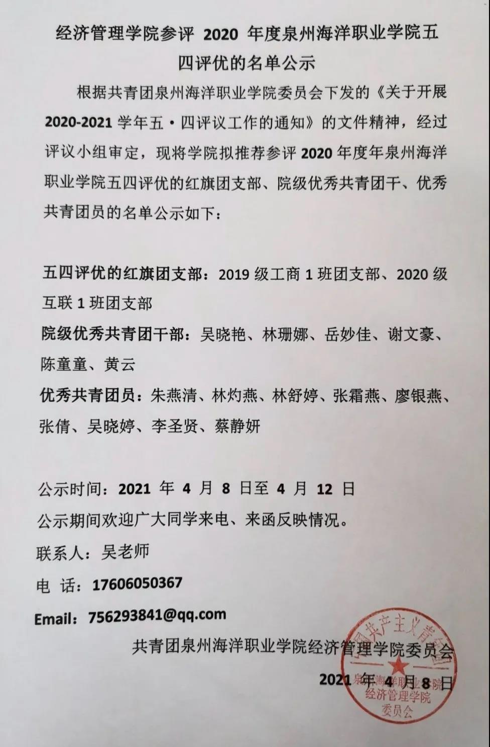 根据共青团泉州海洋职业学院委员会下发的《关于开展2020-2021学年五·四评议工作的通知》的文件精神,经过评议小组审定,现将学院拟推荐参评2020年度年泉州海洋职业学院五四评优的红旗团支部、院级优秀共青团干、优秀共青团员的名单公示如下:
