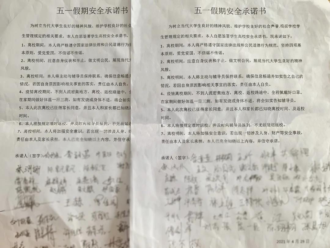 班会结束,各班组织同学们签署了“五一假期承诺书”。