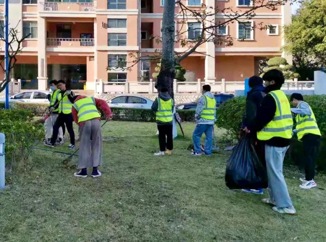 主干道组和绿化组的同学穿着厚厚的衣服,认认真真不辞辛苦地一点一点打扫入袋。