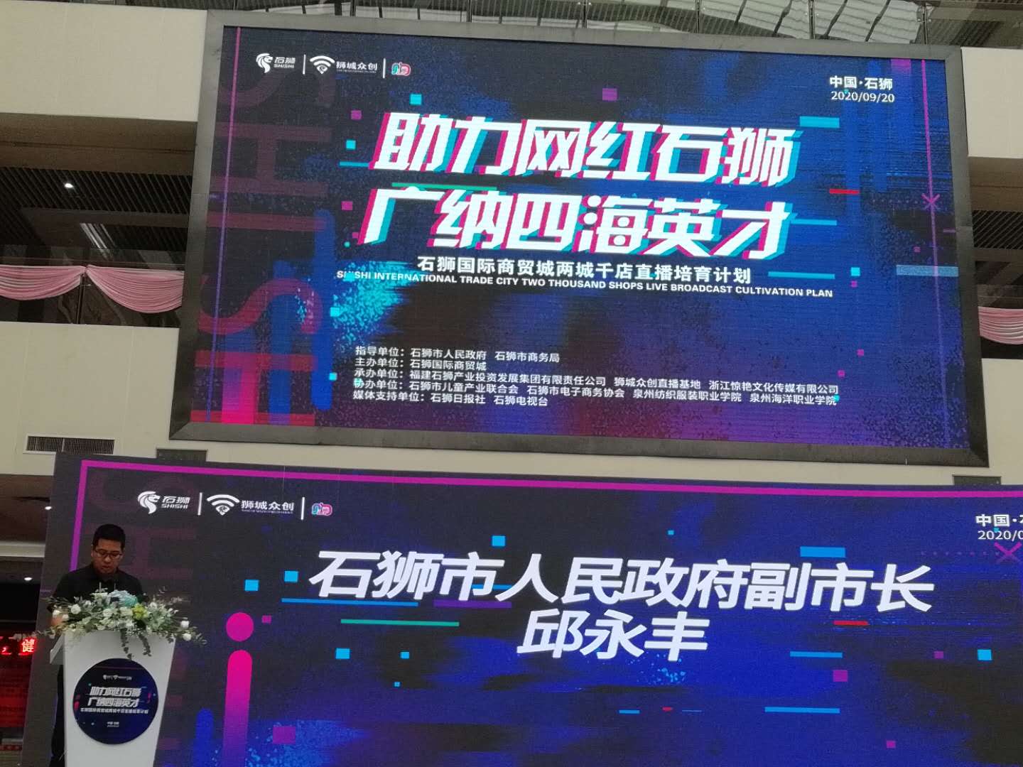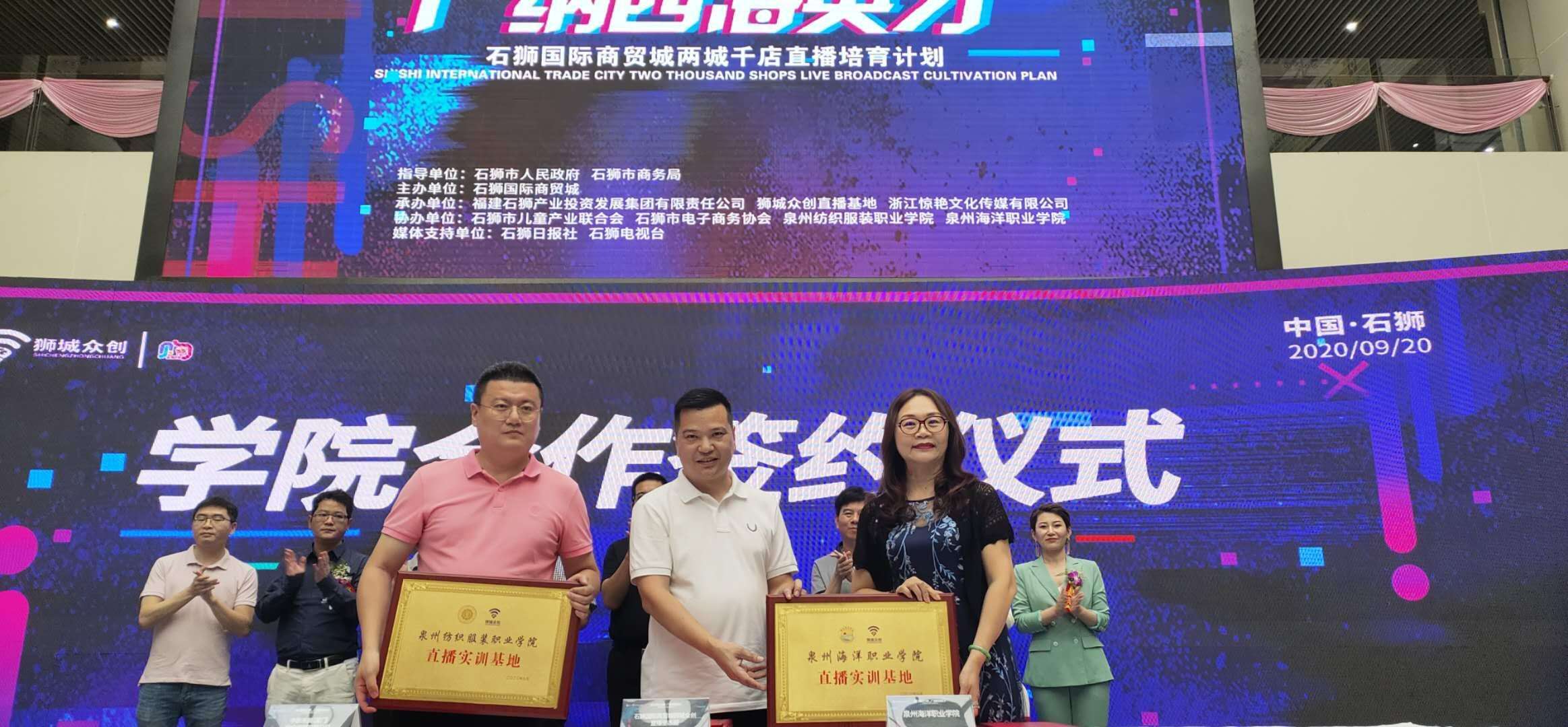 9月20日下午,一场以“助力网红石狮 广纳四海英才”为主题的石狮国际商贸城“两城千店”直播培育计划活动在石狮国际商贸城狮城众创直播生态圈举行。石狮市政府副市长邱永丰,市商务局、产投集团、狮城众创直播生态圈、石狮电子商务协会、石狮儿童产业联合会、浙江惊艳传媒等有关负责人参加活动、我院作为石狮市唯一一所“学院合作签约”参加了此次活动。