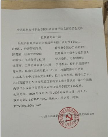 最后经过广泛的党内外谈话,征求党内人士及党外群众意见后,最终经济管理学院支部委员会确定了陈永博、练佳丽等5名同志成为2020上半年经济管理学院党支部拟发展对象。