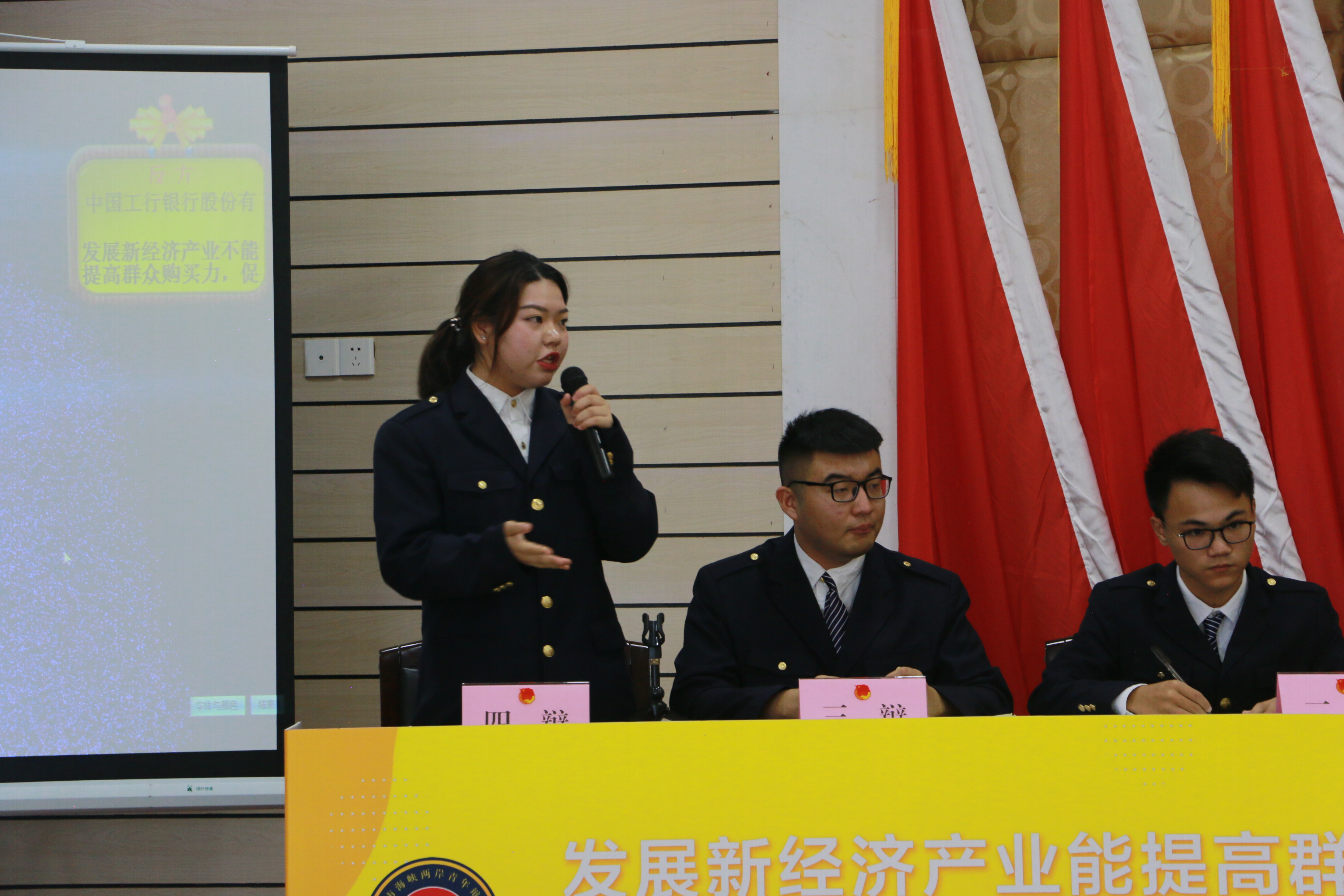 此次选拔赛由12支队伍抽签决定正方的形式对发展新经济产业是否能提高群众购买力,促进经济发展进行辩论。我院工商企业管理181班练佳丽同学代表泉州海洋职业学院带领我院财务管理181班何煖、俞婷等及休闲文旅学院王东洋等同学与中国工商银行有限责任公司石狮支行代表队进行海峡两岸辩论选拔赛,正反双方唇枪舌剑、妙语连珠,辩手们引经据典、数据论证、理论剖析你来我往。在面对突发情况依然不慌不忙,沉着应对严谨做答,将语言的艺术形式彰显的淋漓尽致。