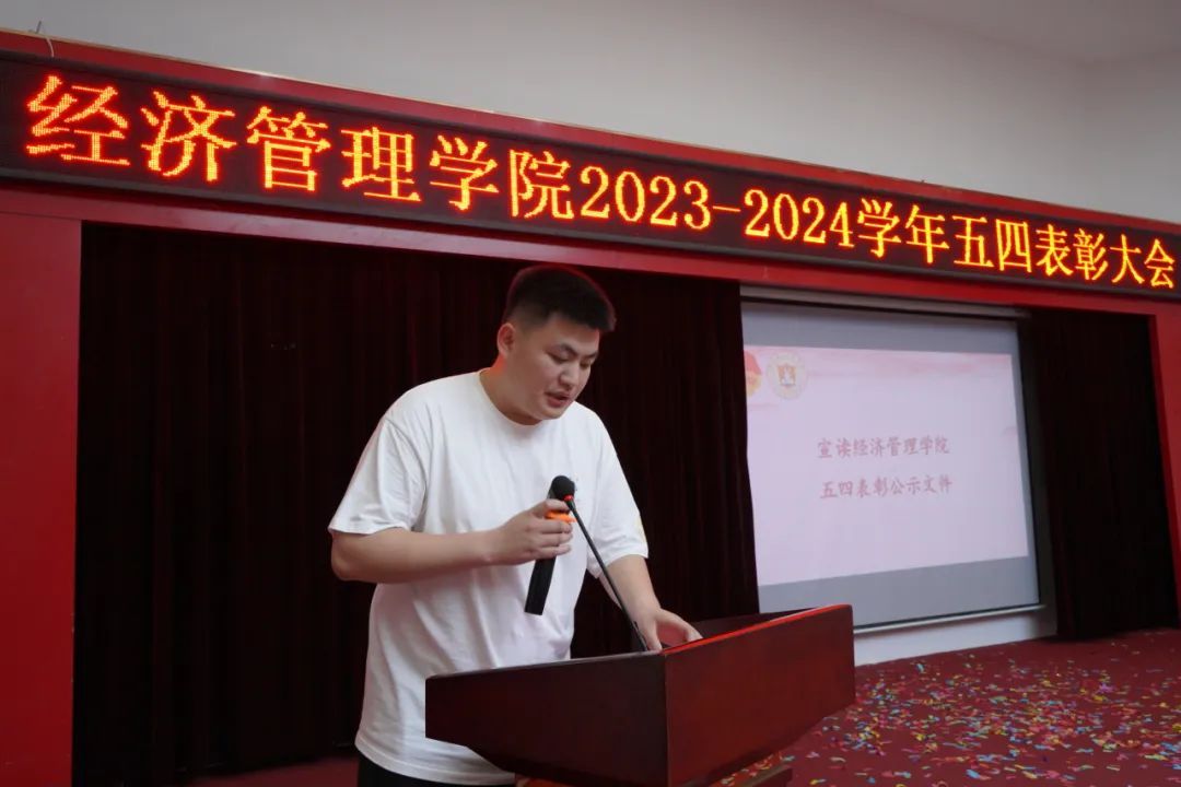 第二项议程:经济管理学院团委书记肖伟强宣读关于表彰经济管理学院2023-2024学年优秀共青团员、优秀共青团干部、红旗团支部公示文件