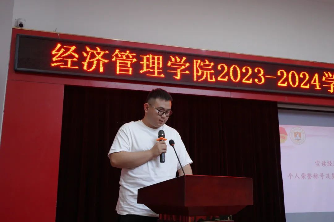 第四项议程:辅导员郑鸿杰宣读经济管理学院2023-2024学年个人荣誉称号及集体荣誉称号公示文件