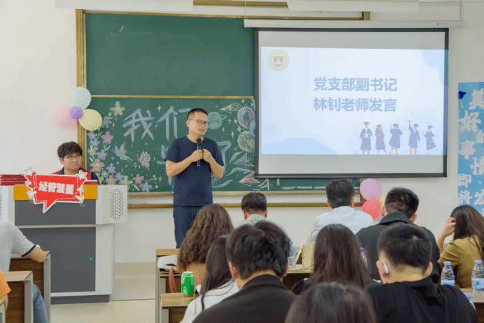 党支部副书记林钊老师发言,林钊老师提醒学生在外要注意安全,同时也希望毕业生们能够始终保持一颗感恩的心,珍惜身边的每一个人和每一次机会,同时也要勇于担当社会责任,为国家的发展和民族的复兴贡献自己的力量。