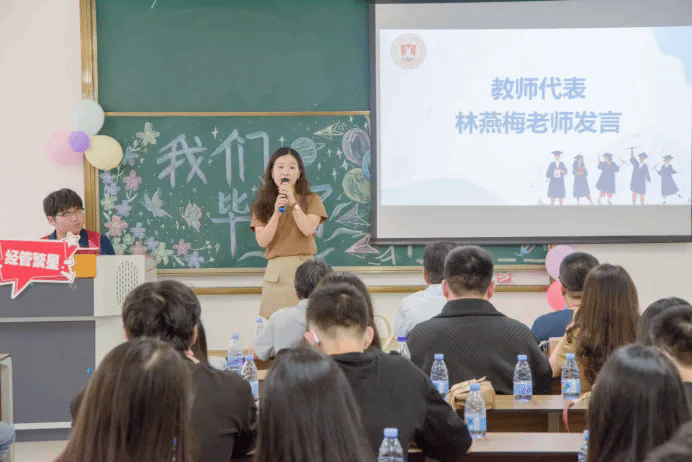 教师代表林燕梅老师发言,她以自己的亲身经历和感悟,为毕业生们上了一堂生动的人生课。她告诉毕业生们要珍惜青春时光,勇敢追求梦想,同时也要注重个人修养和品德塑造,做到德才兼备。