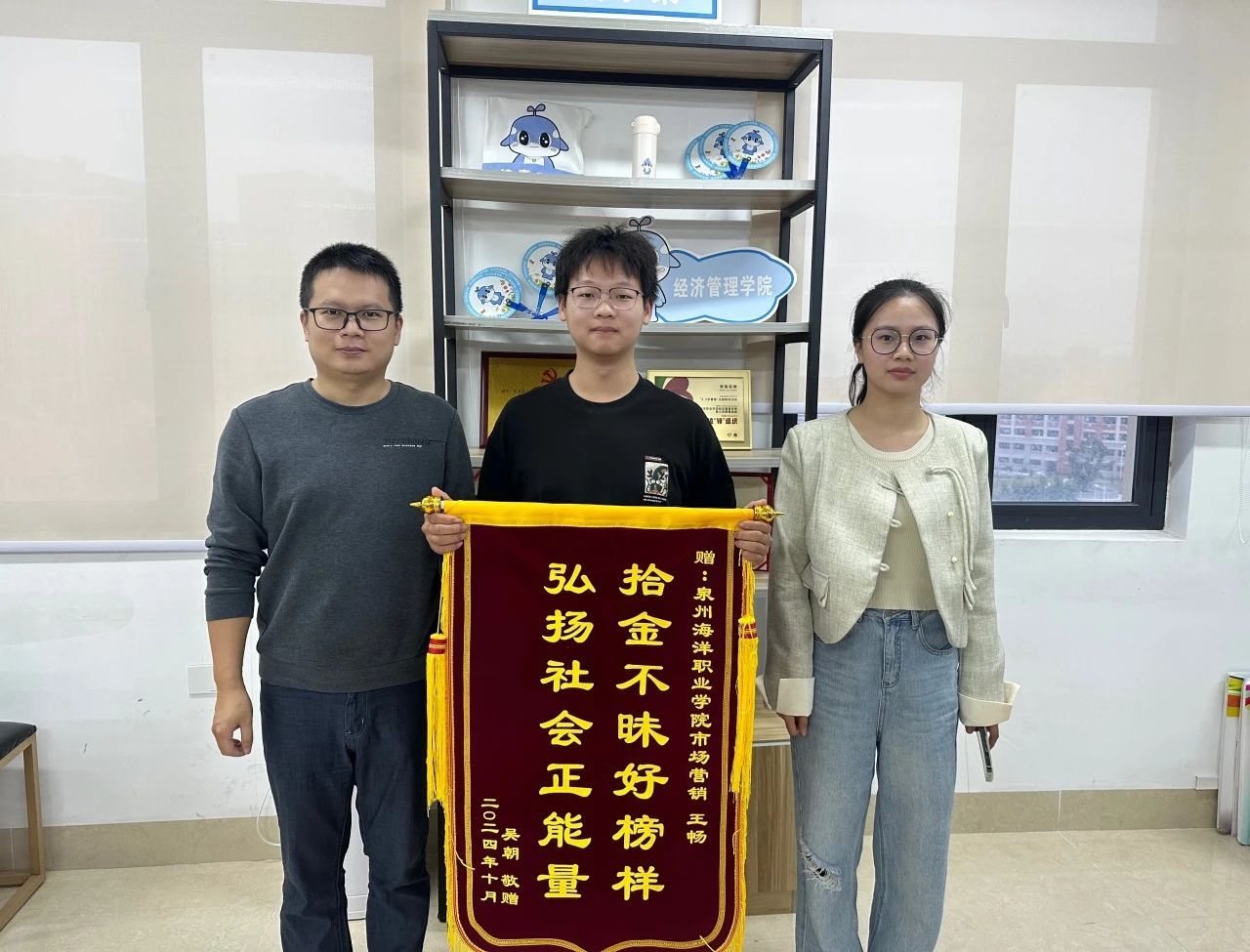 近日,经济管理学院王畅同学在爬山途中捡到他人贵重物品,并及时归还。当时,山上人来人往,十分热闹。王畅像往常一样路过此地,突然,他的目光被地上的一个贵重物品所吸引。他捡起这个失物,发现里面有大量的现金、证件以及一些重要的卡片。在这个时候,他没有丝毫的犹豫,第一时间想到的就是尽快找到失主。