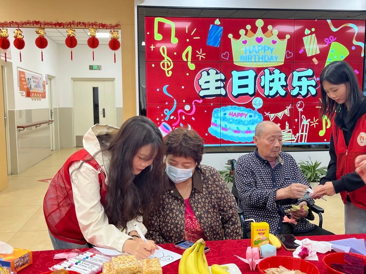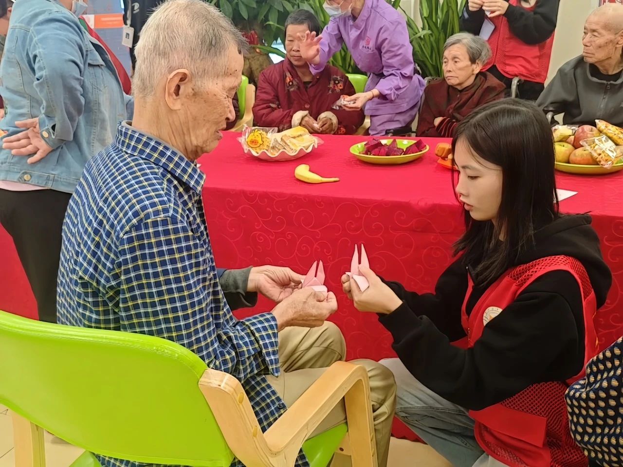才艺表演之后,志愿者们又带领老人们开启了一段奇妙的折纸之旅。一张张彩色的纸张在志愿者的巧手下,瞬间变成了栩栩如生的动物、娇艳欲滴的花朵和精致小巧的纸船。此次志愿者活动,不仅仅是一场简单的生日聚会和娱乐活动,更是一次心灵的交流与陪伴。志愿者们用自己的行动诠释了关爱老人的深刻内涵,让老人们在养老院中也能感受到家一般的温暖与关怀。