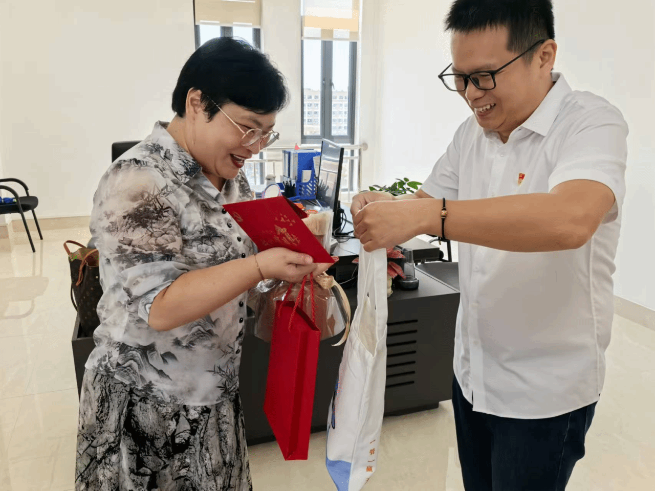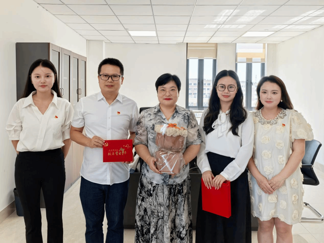 党支部书记林钊为在党20周年的党员唐学学同志送上贺卡及礼物,这份礼物既表达了组织的殷切祝福也传递了一份沉甸甸的政治责任。