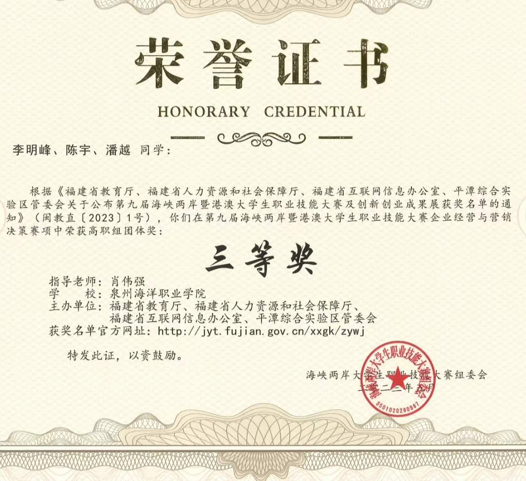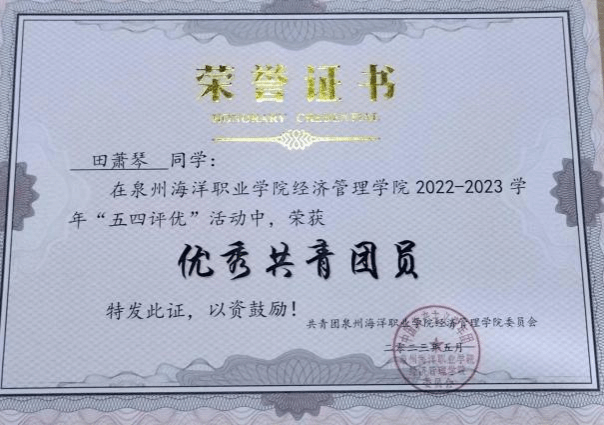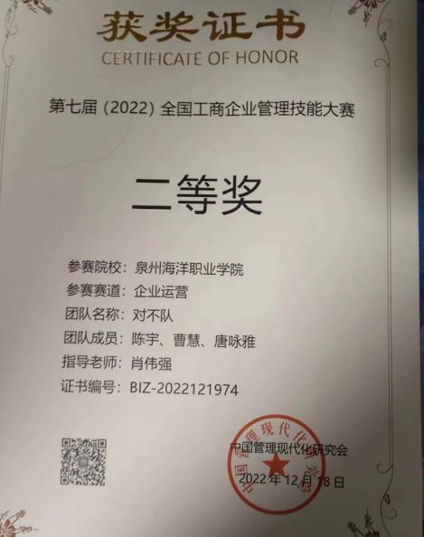 该团支部学风、班风良好,支部成员学习勤奋,违纪率低,平均成绩高,支部成员积极参与学院的科技与创新活动,积极参加学院各系部、社团举办的各项活动,并取得优异成绩。支部田萧琴同学获“2022年全国大学生创新能力大赛三等奖”,并被评为优秀共青团员,李明峰同学获九届海峡两岸暨港澳台大学生职业技能大赛企业竞争模拟竞赛“三等奖”,陈宇同学获第七届全国工商企业管理技能大赛“二等奖”,杨娄,李珊同学在“外研社·国才杯”福建省大学生商务谈判大赛”荣获三等奖。