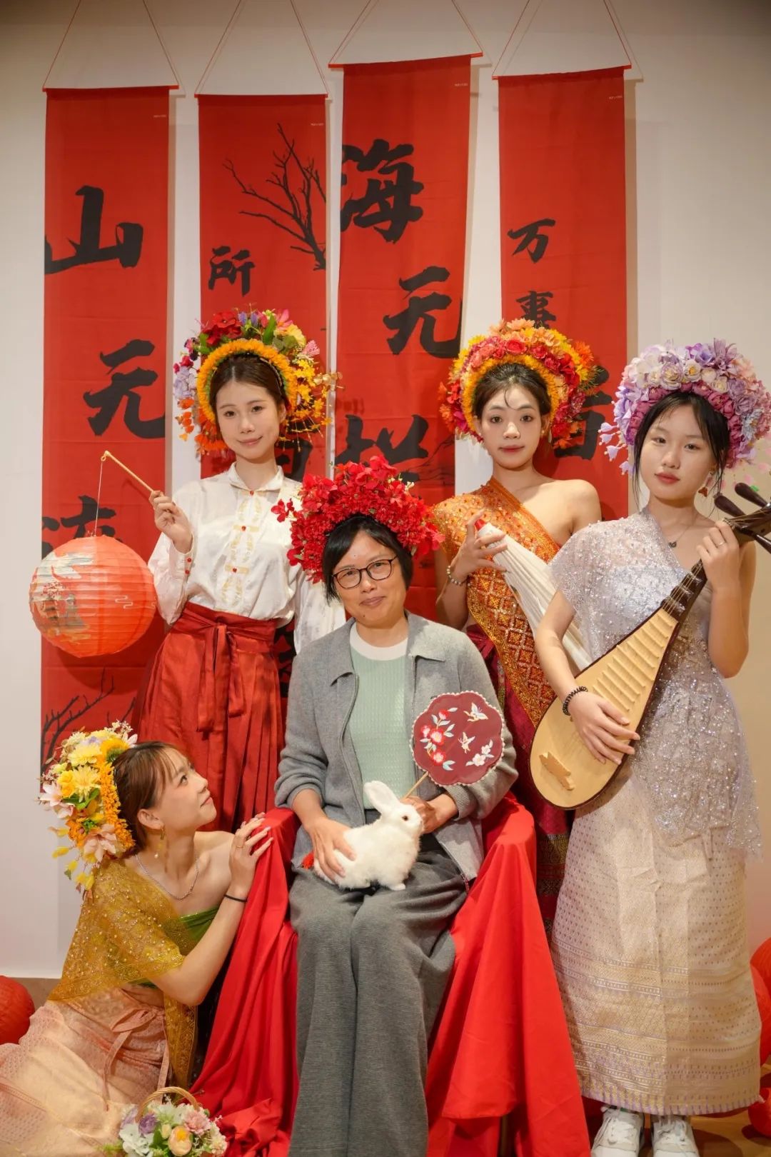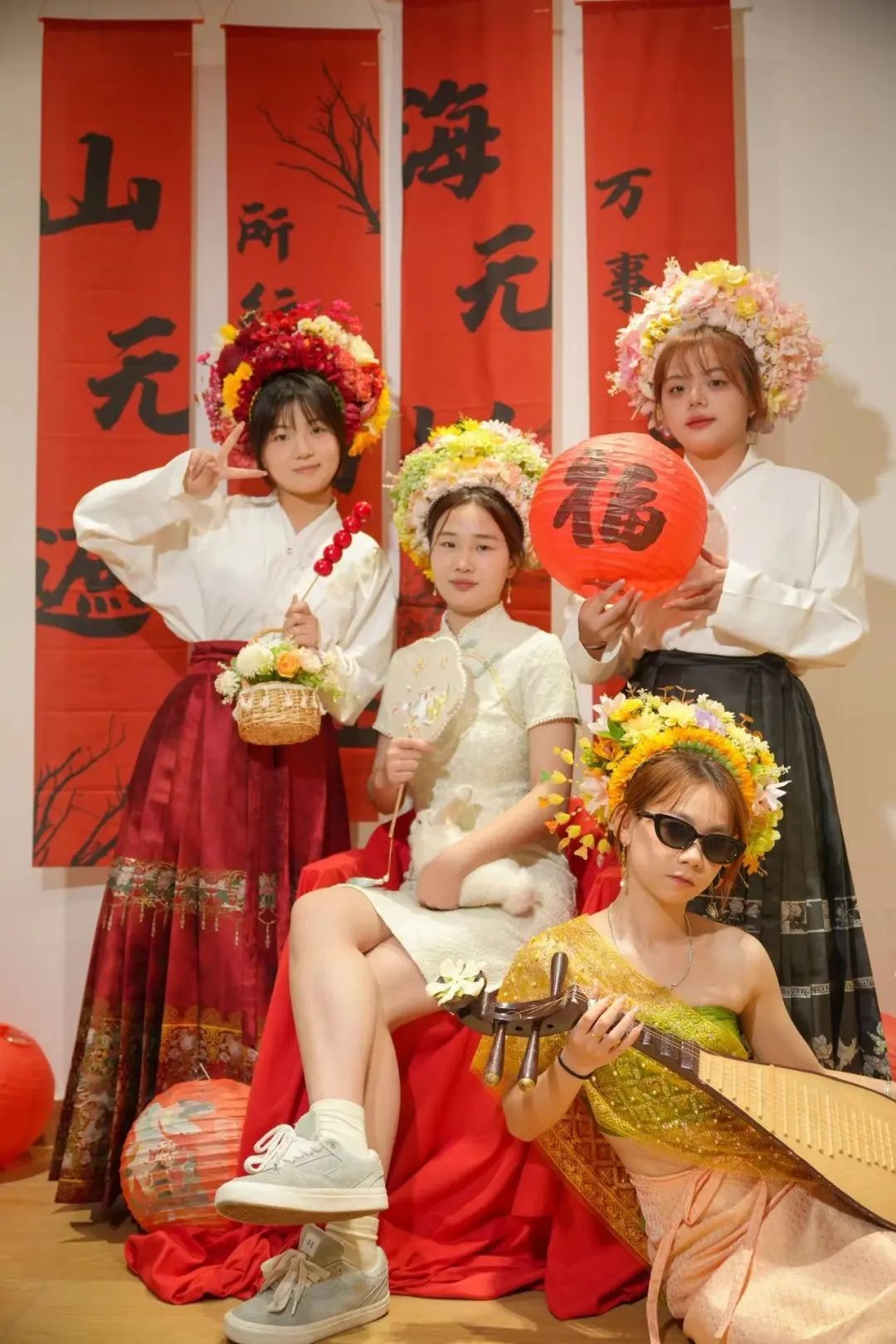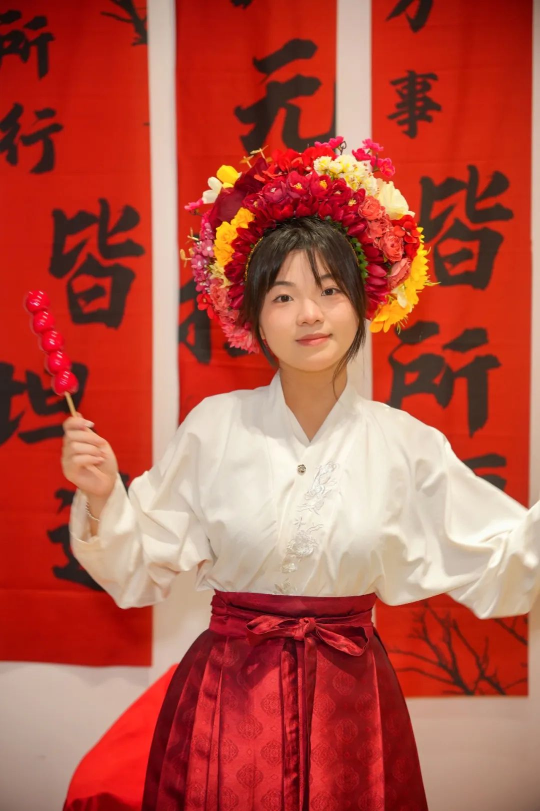 挑花、插花、拍照......活动现场气氛热烈、笑语盈场。簪好花的模特人员带着精美的簪花作品,向在场的同学们展示了“簪花围”的独特魅力,一边展示精湛技艺,一边讲解“簪花围”的历史渊源和文化内涵,让同学们感受到了传统民俗的深厚底蕴和无限魅力。