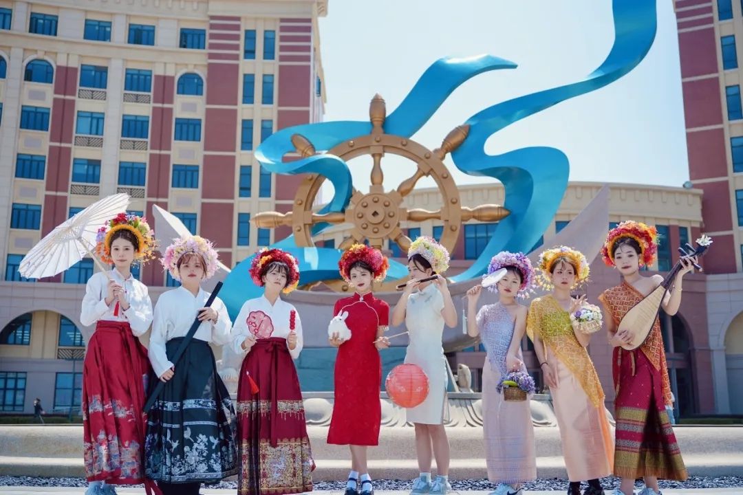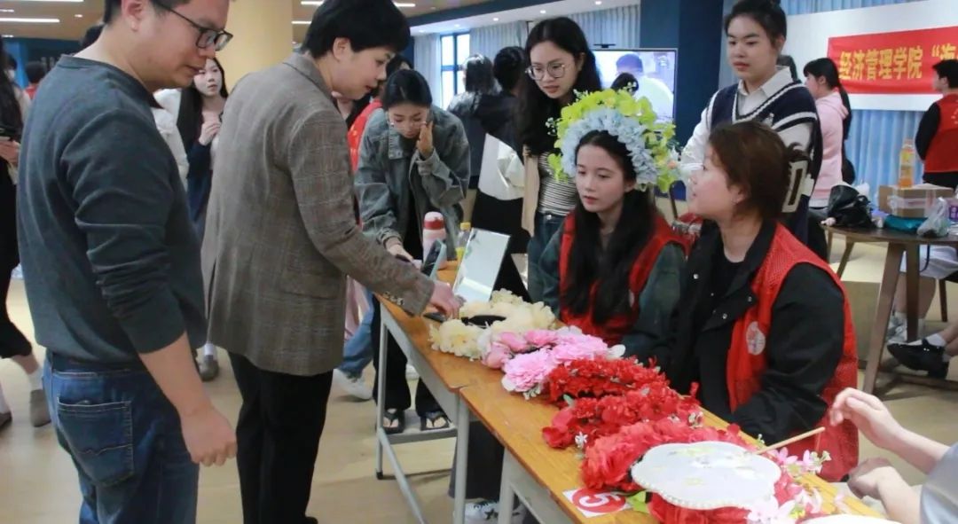 人间最美三月天,春花烂漫展新颜。活动一开始,桌子上的簪花道具就吸引了同学们的围观,大家各自挑选心仪的民族服饰,点缀淡妆,再经过工作人员们的巧手编织,将春天和浪漫戴在头上,簪花满头,风情与共。校党委书记郑艳、副校长黄瑞梅等领导莅临活动现场,共同感受簪花之美。