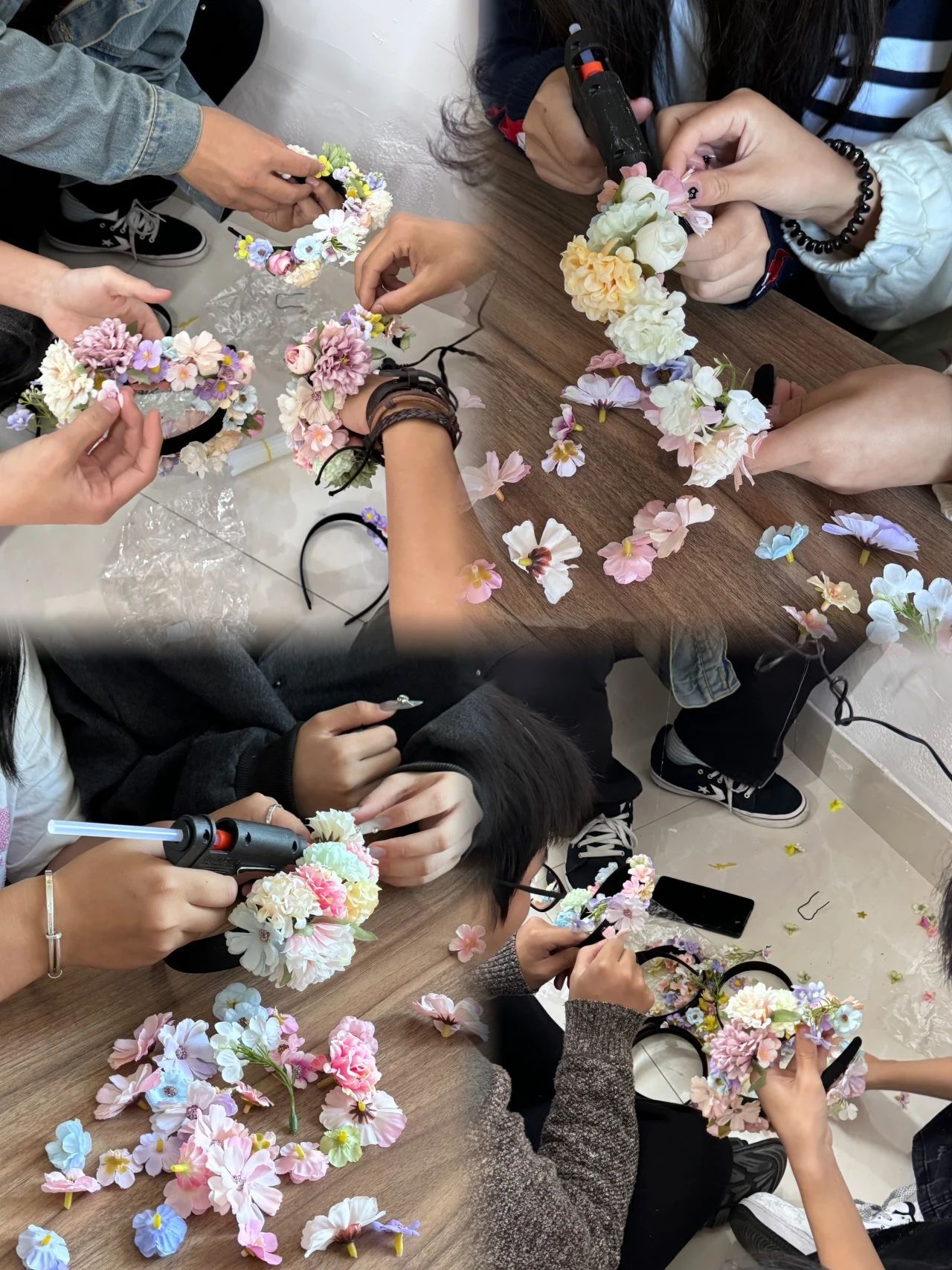 活动现场,成员们开始大胆地进行配色和粘制,一层层花骨朵在发箍上绽放,他们间相互交流、相互探讨,活动室里洋溢着欢声笑语,成员们陆陆续续完成了簪花,留下了美丽的印记。