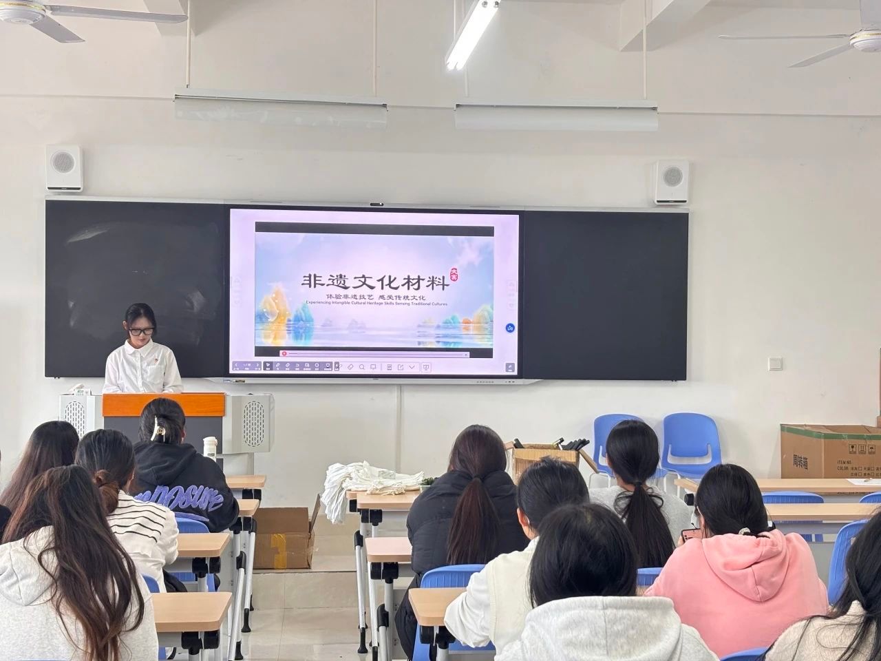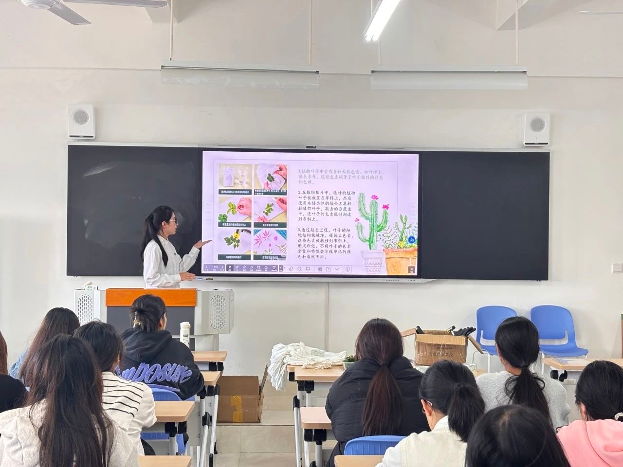 活动伊始,会计2402班团支书俞雨萱同学带领全体同学观看关于植物拓染非遗技艺的视频。视频中,传统匠人巧手操作,将植物的色彩与形态完美地呈现在布料上,古老的技艺与现代的创意交织碰撞,展现出非遗文化的独特魅力,让人不禁为这份技艺的精湛与独特而赞叹。
