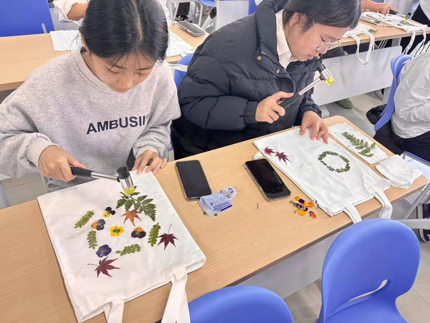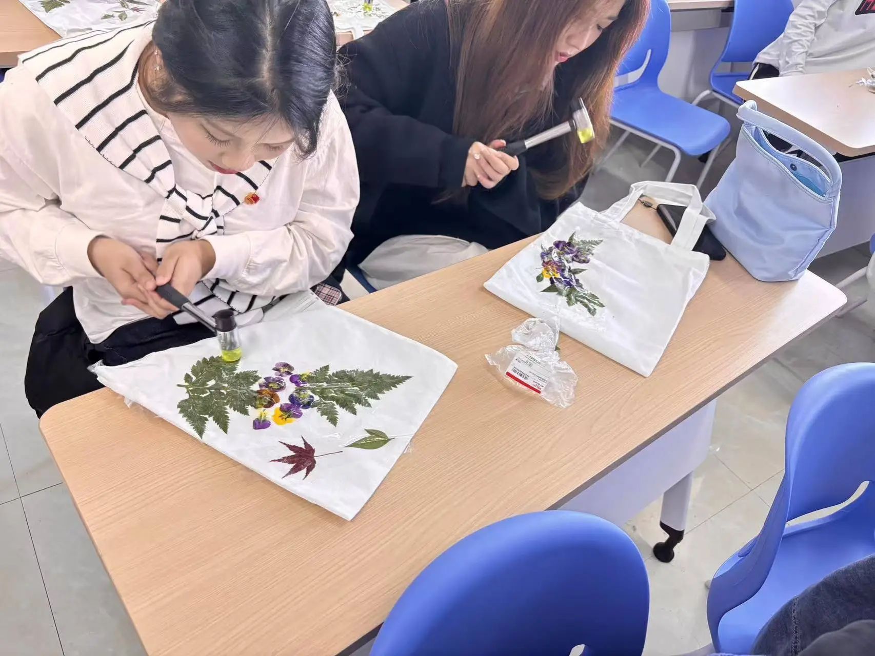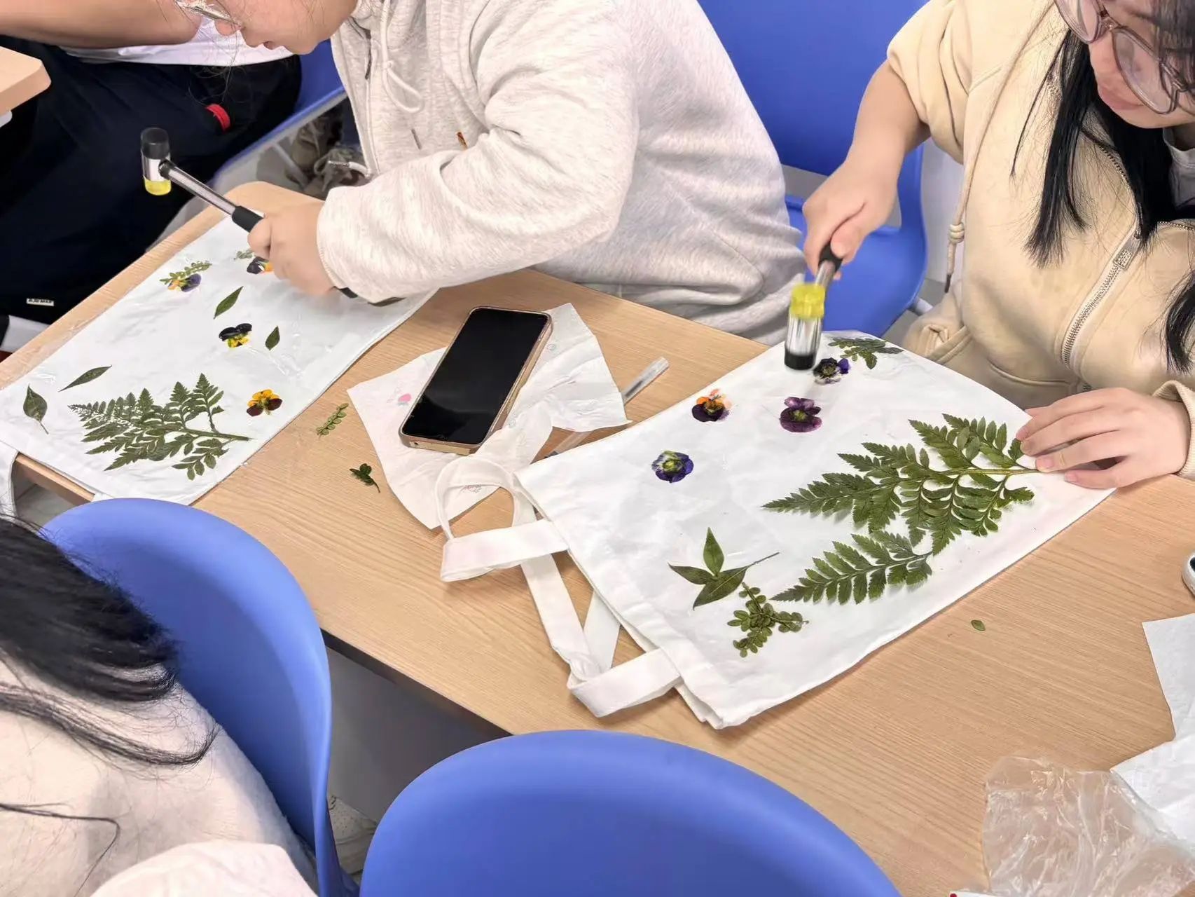 活动过程中,会计2405班团支书薛凯琪同学指导大家开始制作属于自己的拓染作品。一把锤子、一块布料,加上随处可见的花和树叶,固色、定位、敲打,就可以把植物的自然形状、脉络纹理和色彩留在布上,留下大自然最原始的味道 、纹理和色彩。从挑选植物、布料,到固定作品,敲打拓染,每一步都充满了挑战与乐趣,大家都沉浸在这份独特的艺术创作中。这不仅在制作中能感受到大自然的神奇,更能感知非遗技艺"拓印"的魅力和中华文化的博大精深。
