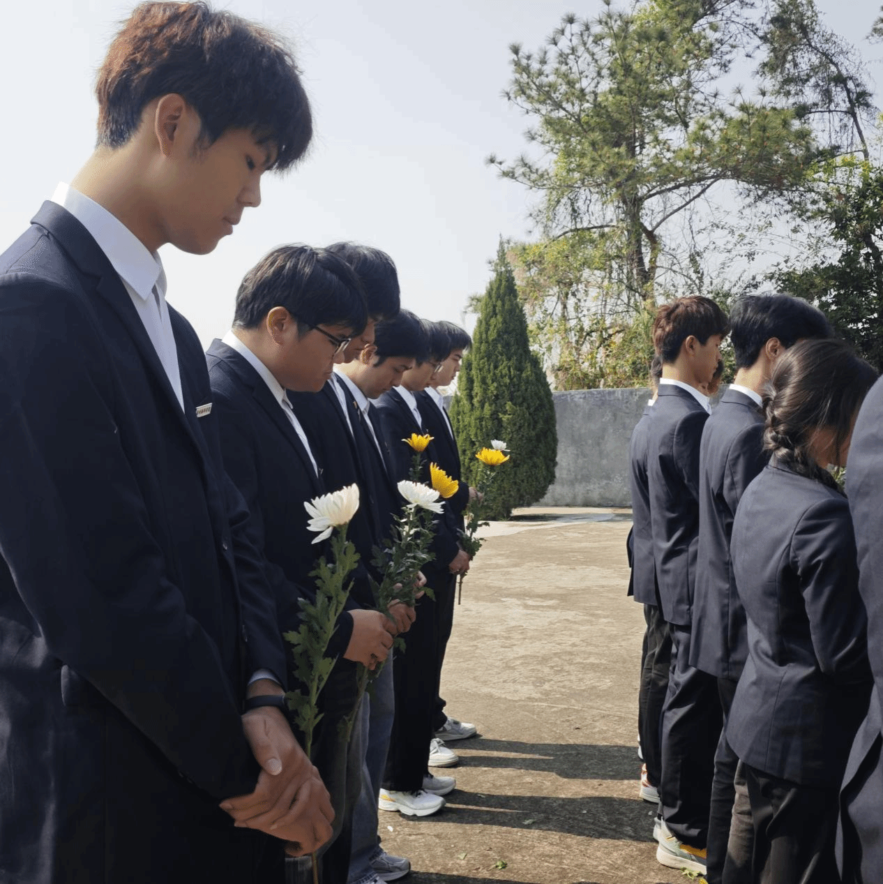 在辅导员刘芳妊的引导下,依次上前敬献花束,鞠躬悼念。青年学子感怀英雄事迹,纷纷表示会深化对先烈的敬仰之情,以弘扬革命文化与奋斗精神的志气,着力继承老一辈革命家的优良传统,努力成长为可堪大用、能担重任的栋梁之材。