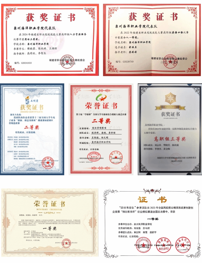 在董事会领导和学校领导的大力支持下,经济管理学院教职工大力组织学生参与福建省职业院校技能大赛、海峡两岸暨港澳大学生职业技能大赛、全国大学生电子商务“创新、创意及创业”挑战赛等,通过组织学生参加各级各类职业技能大赛,近两年荣获国家级荣誉30项,省级荣誉80项。职业技能大赛不仅锻炼学生的技能,培养学生专业实践能力,提高人才培养质量。