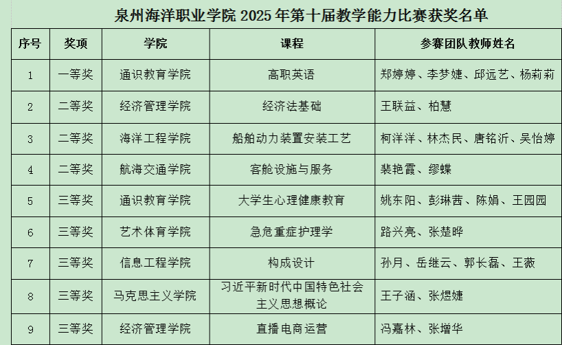 为全方位展现教师教学风采,深度促进教学经验的交流与共享,着力推动我校职业教育事业的高质量发展,全面对接2025年福建省职业院校教师技能大赛,我校于5月21日隆重举行“泉州海洋职业学院第十届教学能力比赛”决赛。
