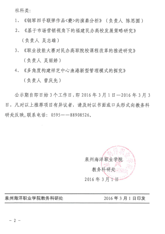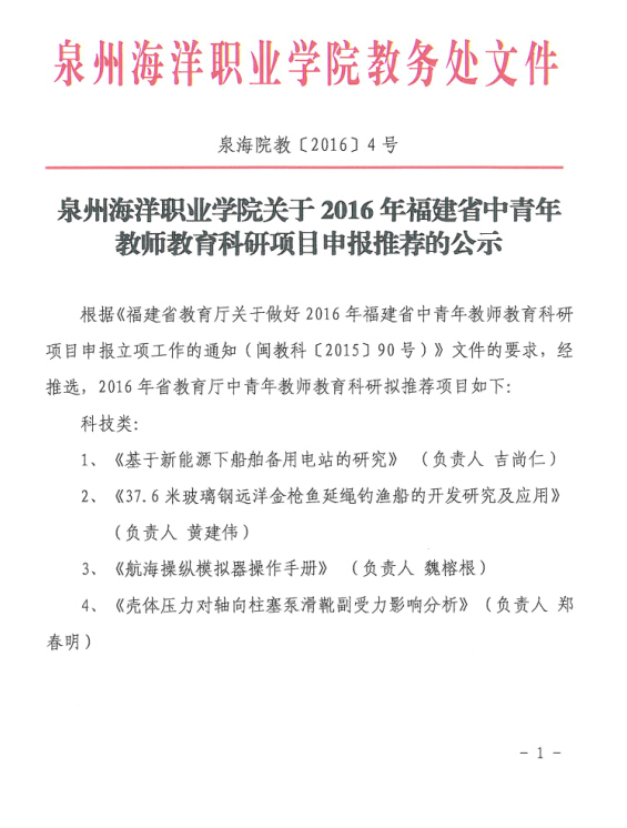 泉州海洋职业学院关于2016年福建省中青年教师教育科研项目申报推荐的公示